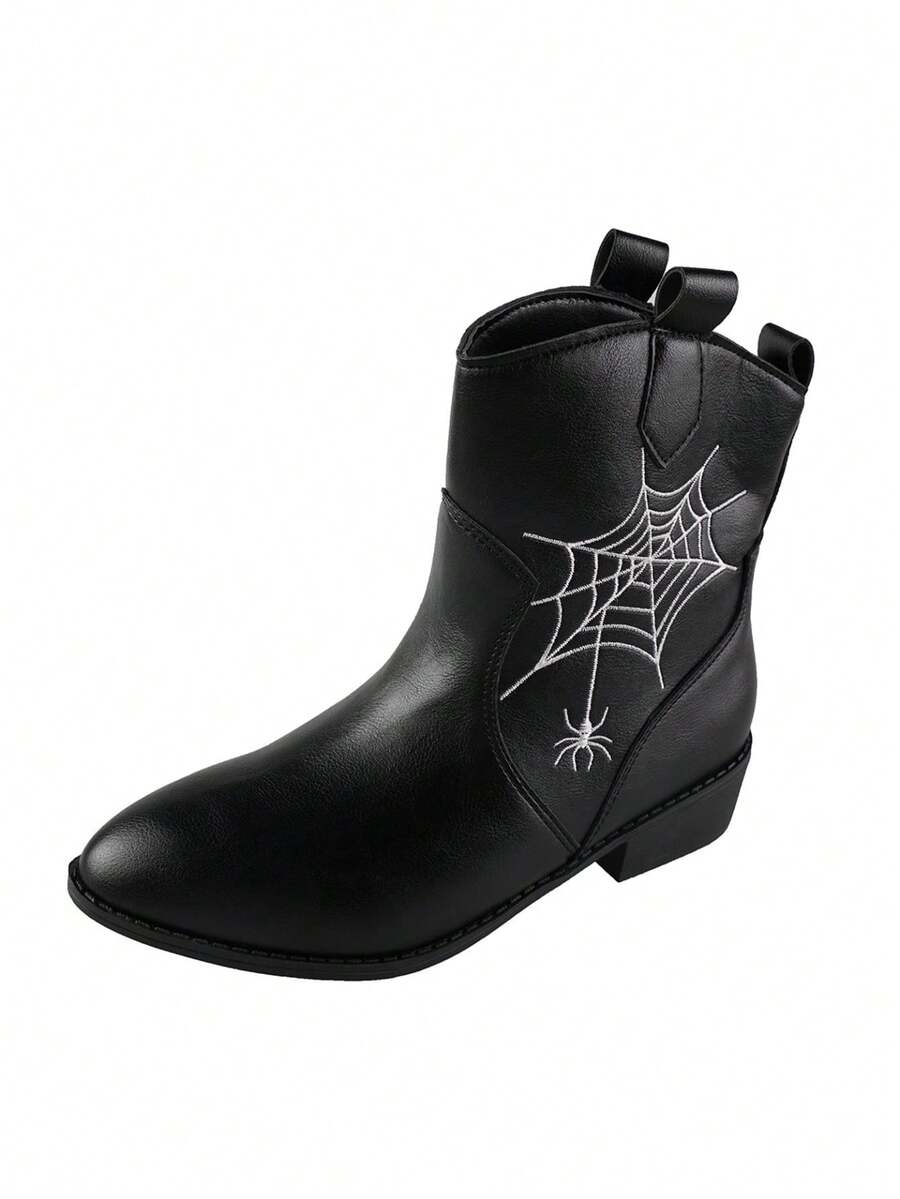 Goth Women Spider Web Embroidered Point Toe Western Boots, Cool Outdoor Fashion Boots