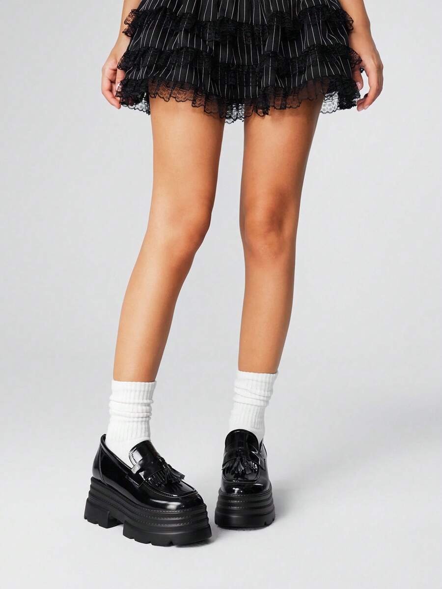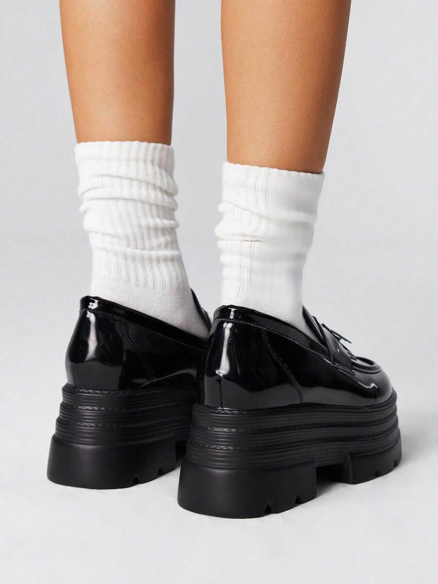 Goth Women's Black Leather Mary Jane Slip-On Loafers, Japanese School Uniform Style Shoes, Dress/Work Pumps With Platform & Chunky Heel