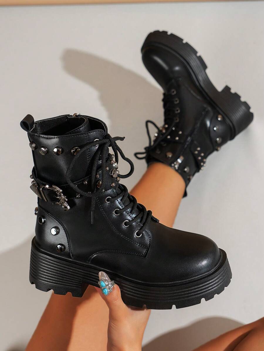 Goth Women's Black Punk Metal Rivet Belt Buckle Platform Thick Sole Roman Wedge Heeled Daily Fashion Versatile PU Short Shaft Boots With Side Zipper For Christmas
