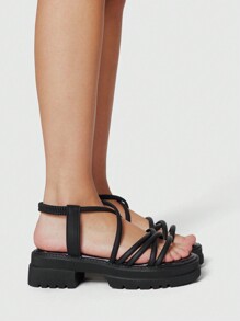 Goth Women's Black Roman Beach Sandals, Summer Open Toe Elastic Criss-Cross Strap Vacation Shoes, Platform Wedge Heels