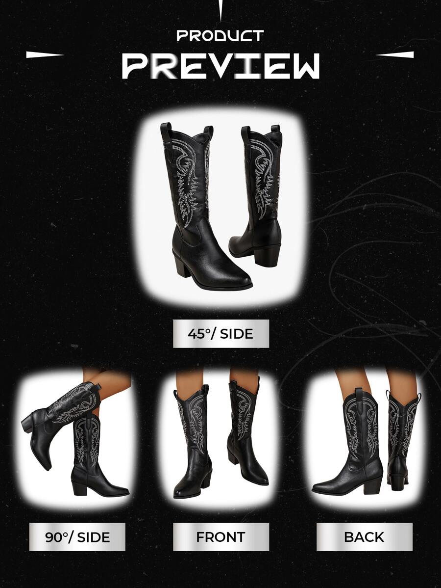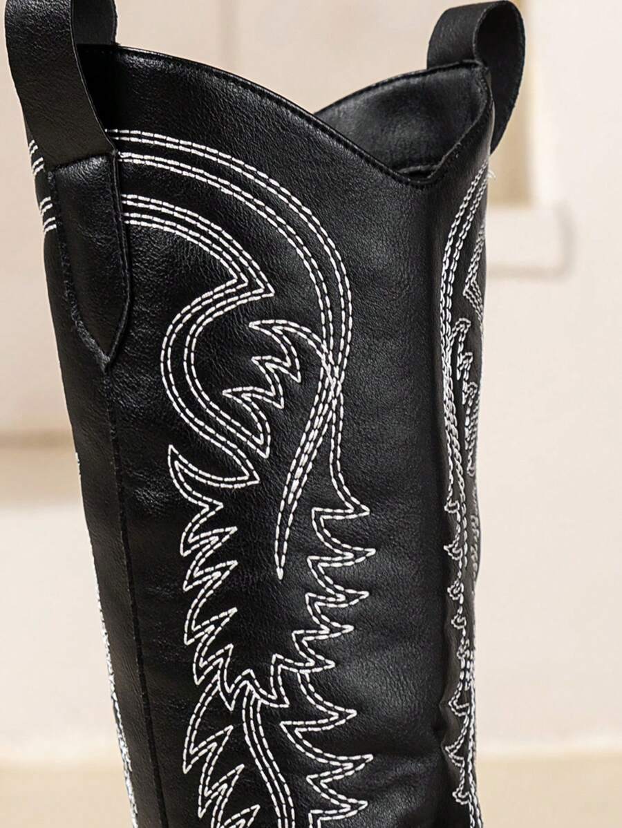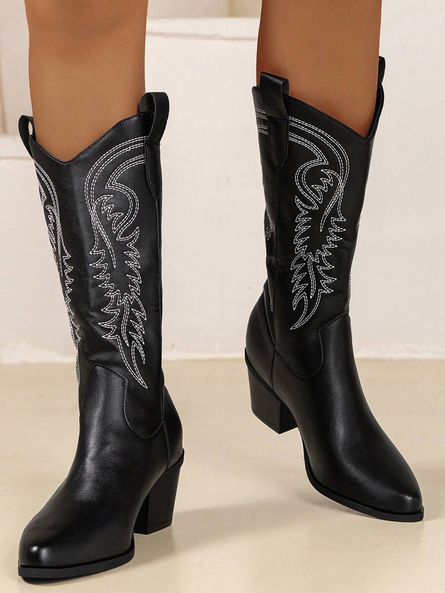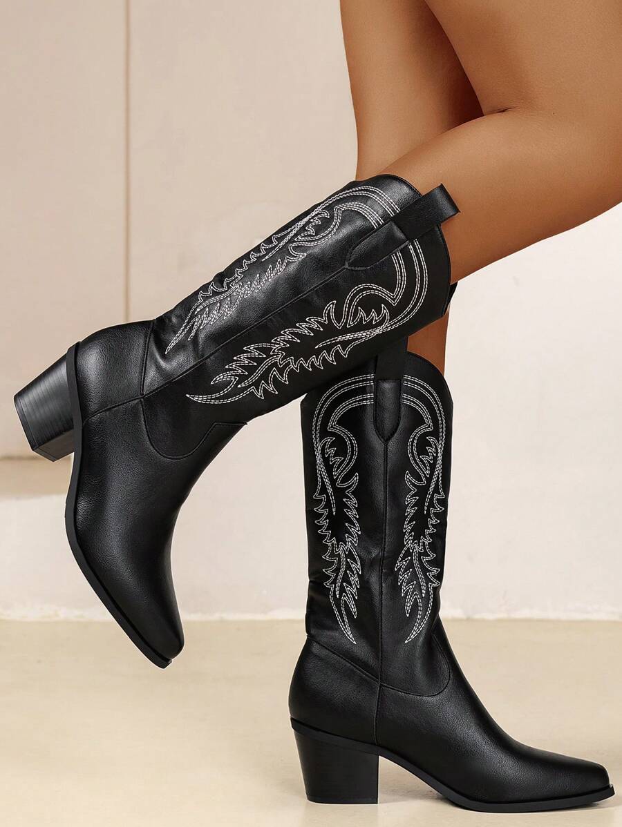Goth Women's Black Western Cowboy Boots With Embroidery, Pointy Toe & Chunky Heel, New Arrivals For Spring/Autumn Spring Shoes