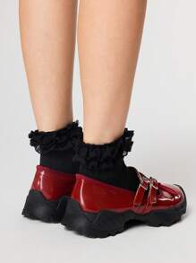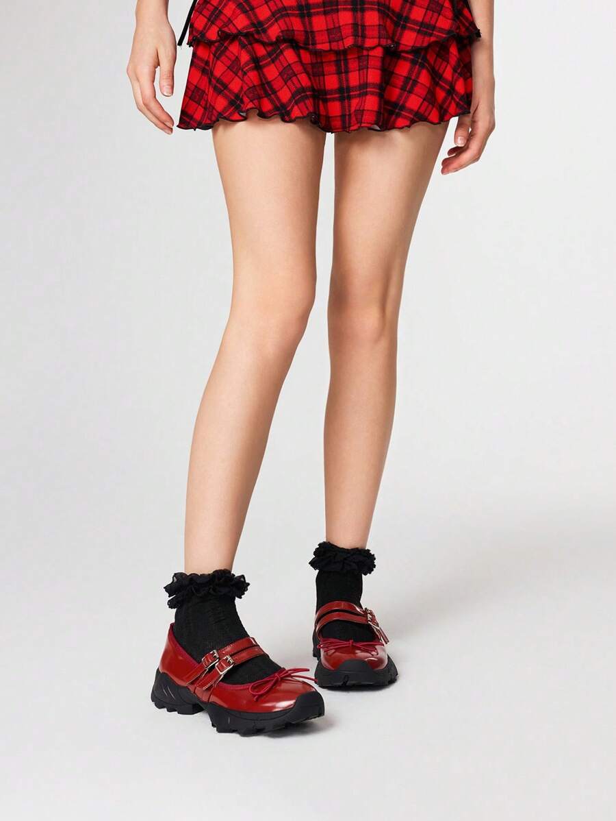 Goth Women's Bowknot Round Toe Chunky Sole Ballet Flats, PU Material, Burgundy Color, Buckle Design, Suitable For Sports, Graduation, Photography