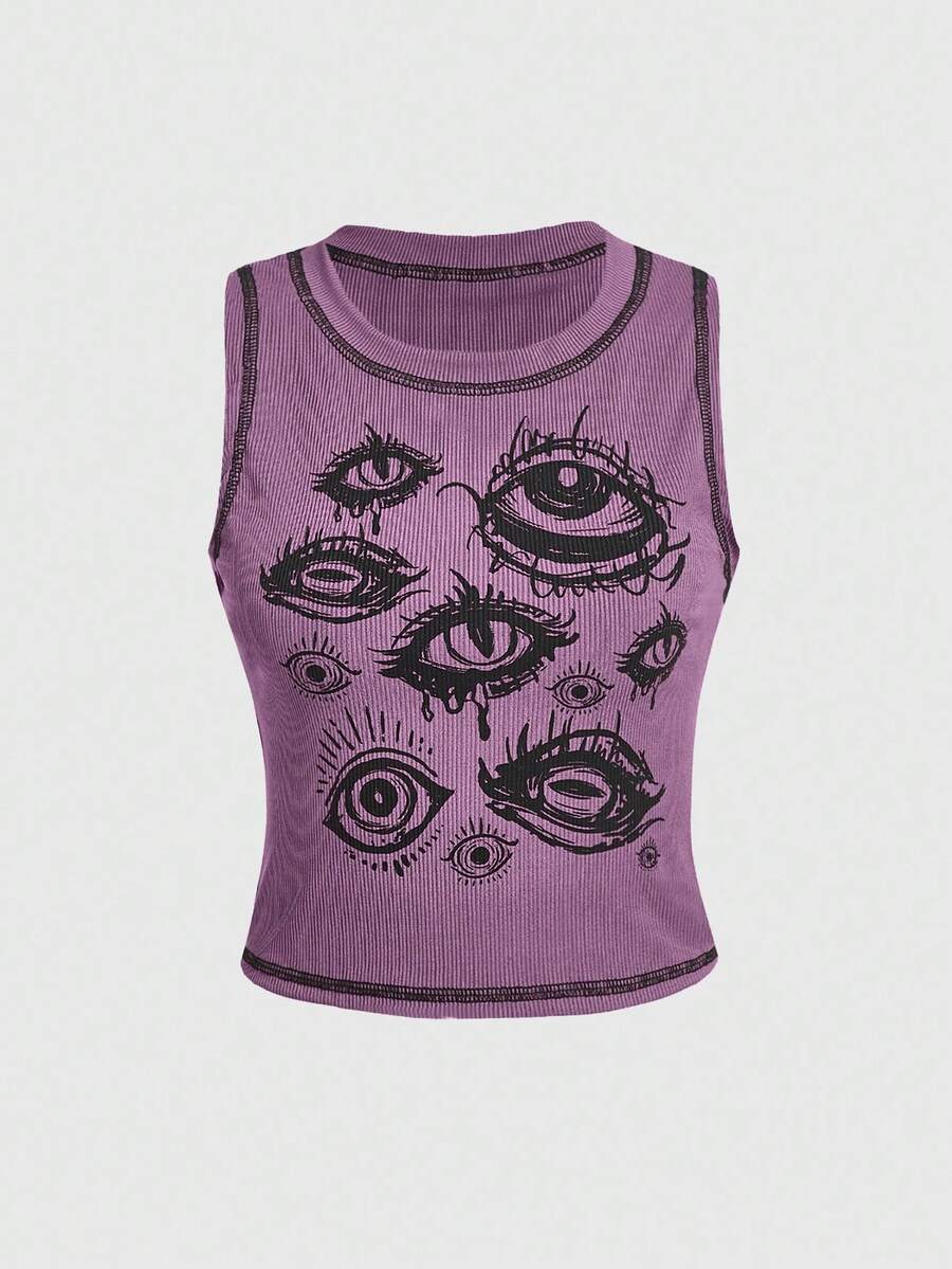 Goth Women's Casual Vintage Eye Print Color Block Design Tank Top, Deep Purple