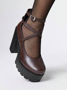 Goth Women's Closed Toe Cross-Strap Mary Jane Shoes, Punk Goth Platform Thick Heel Strap Buckle Strap JK Uniform Shoes, Waterproof Formal Work High Heels