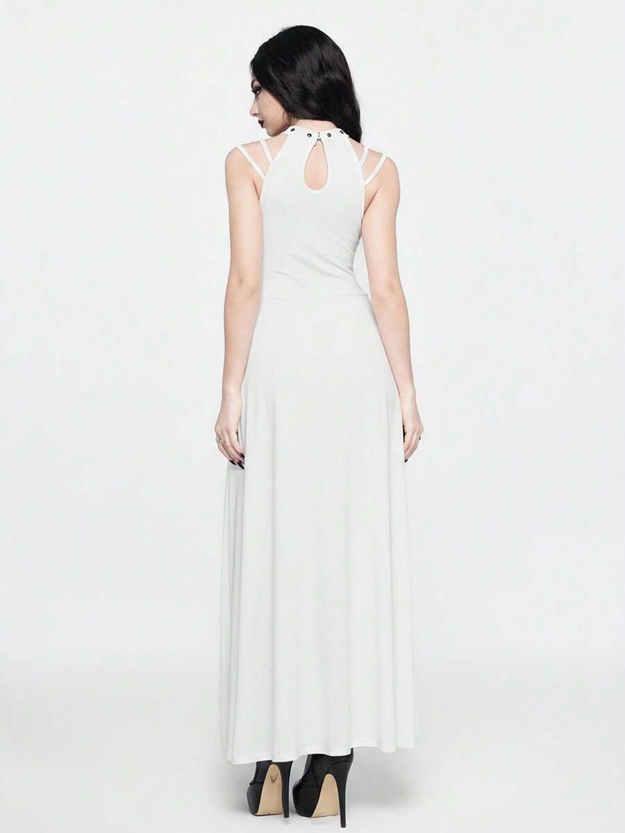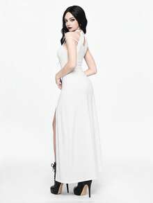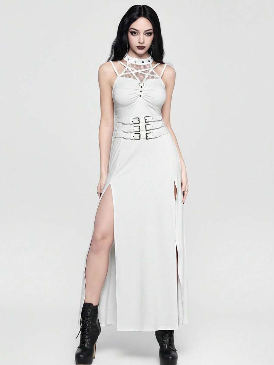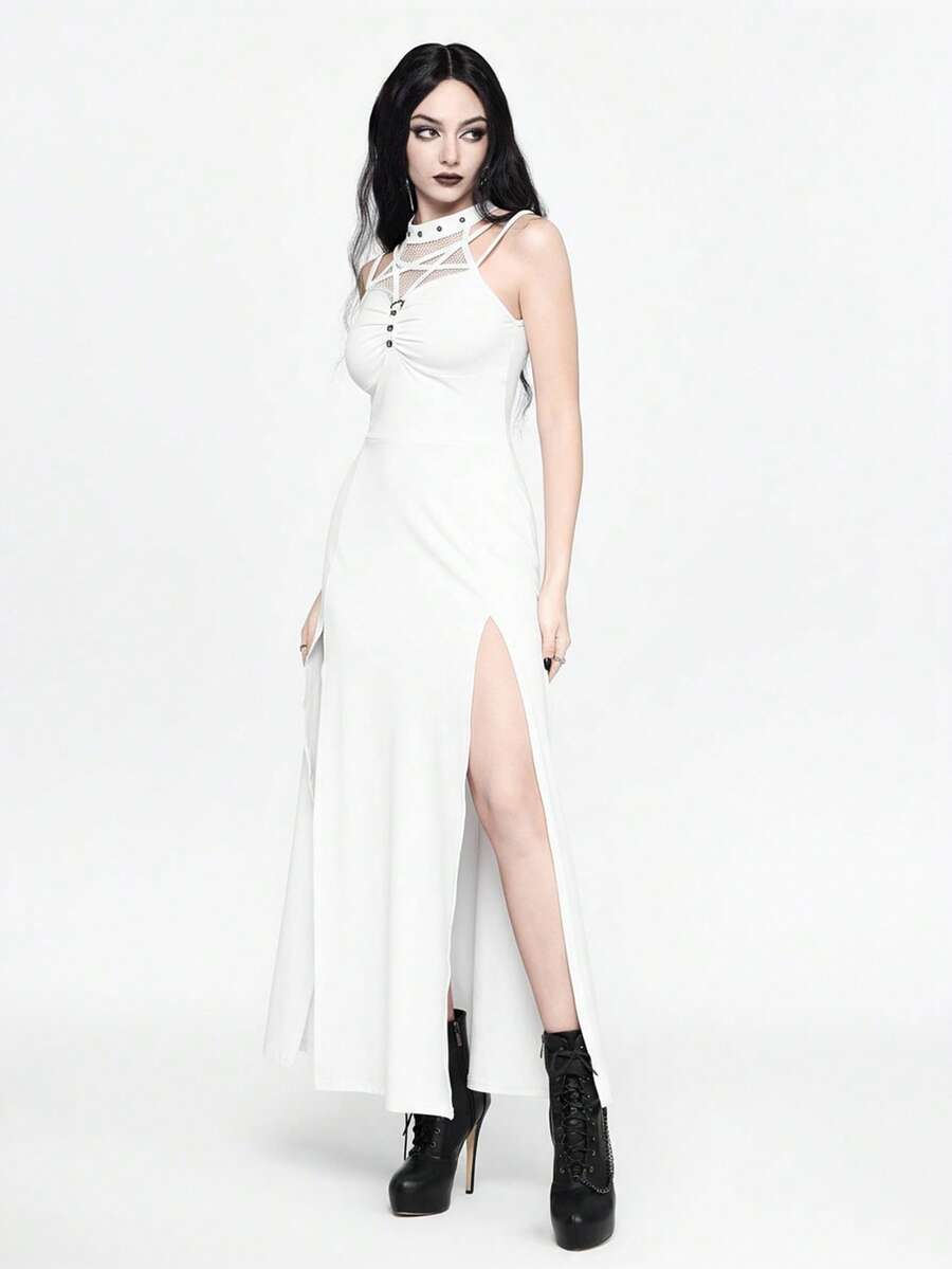 Goth Women's Fashion Punk Patchwork Fishnet Halter Bodycon Split Midi Dress