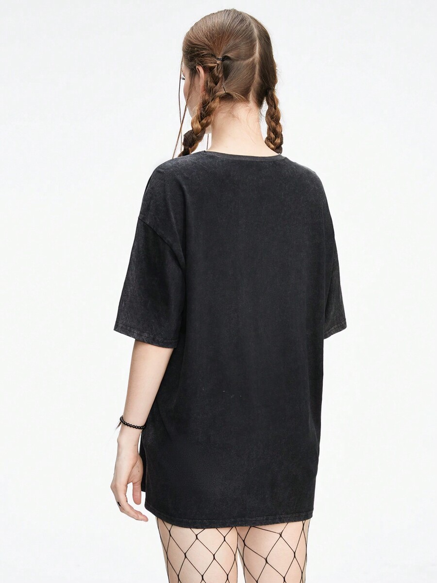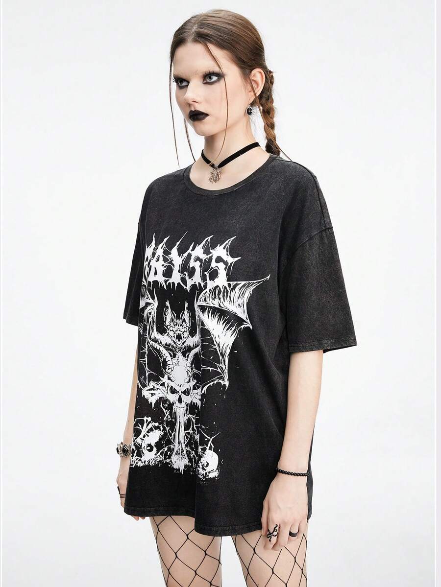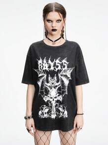 Women's Gothic Bat And Cross Printed Distressed T-Shirt For Summer