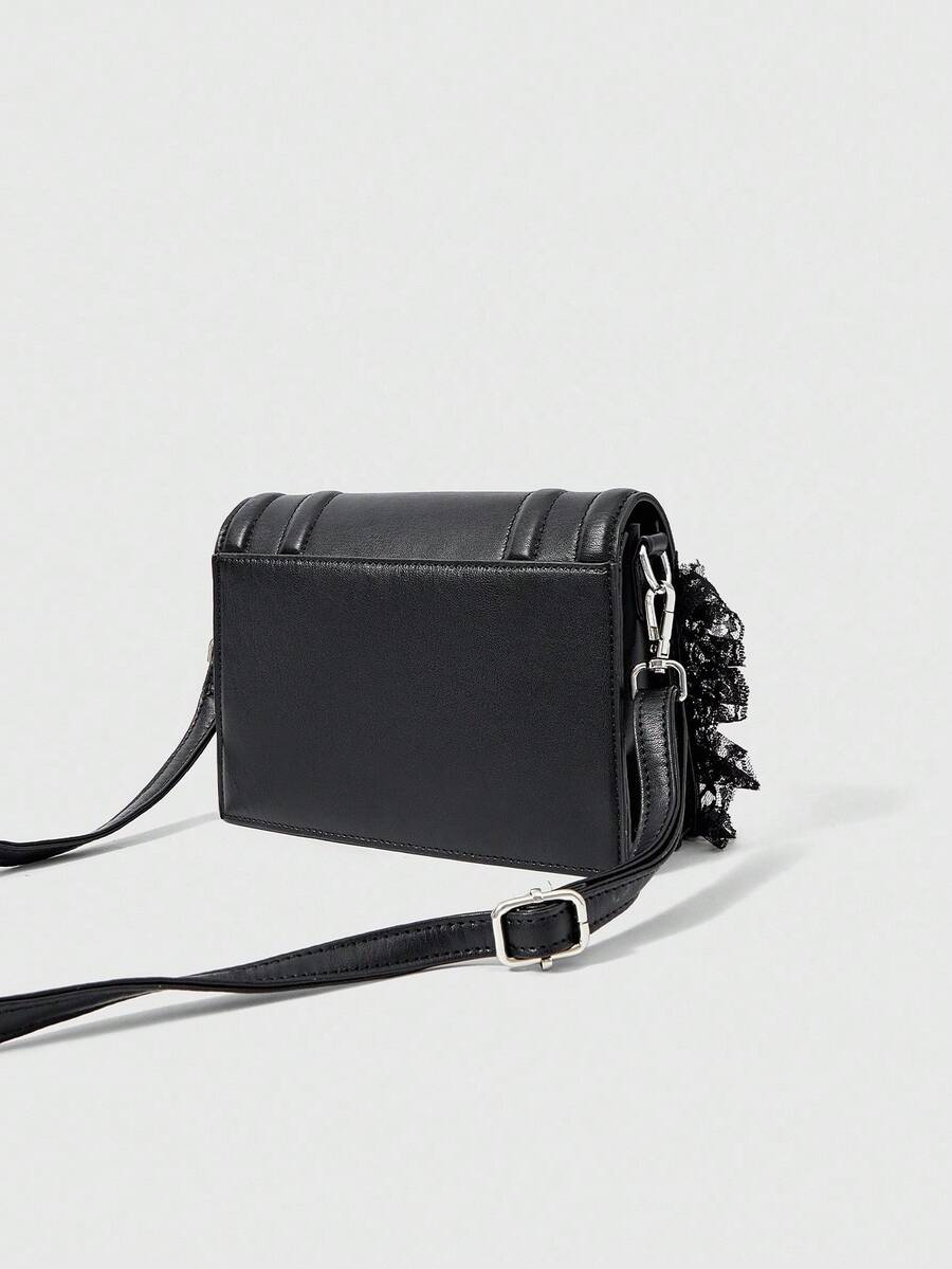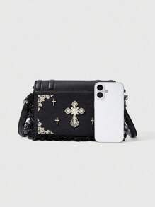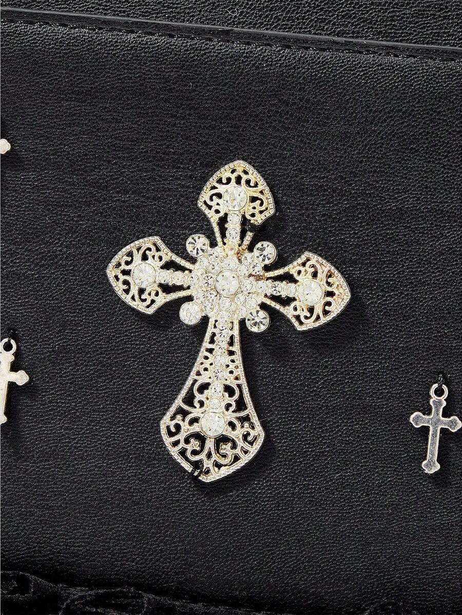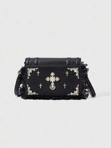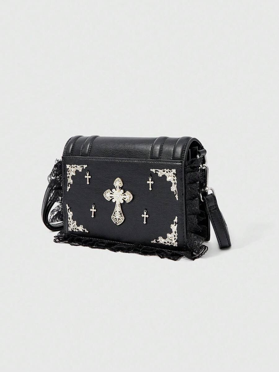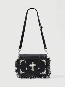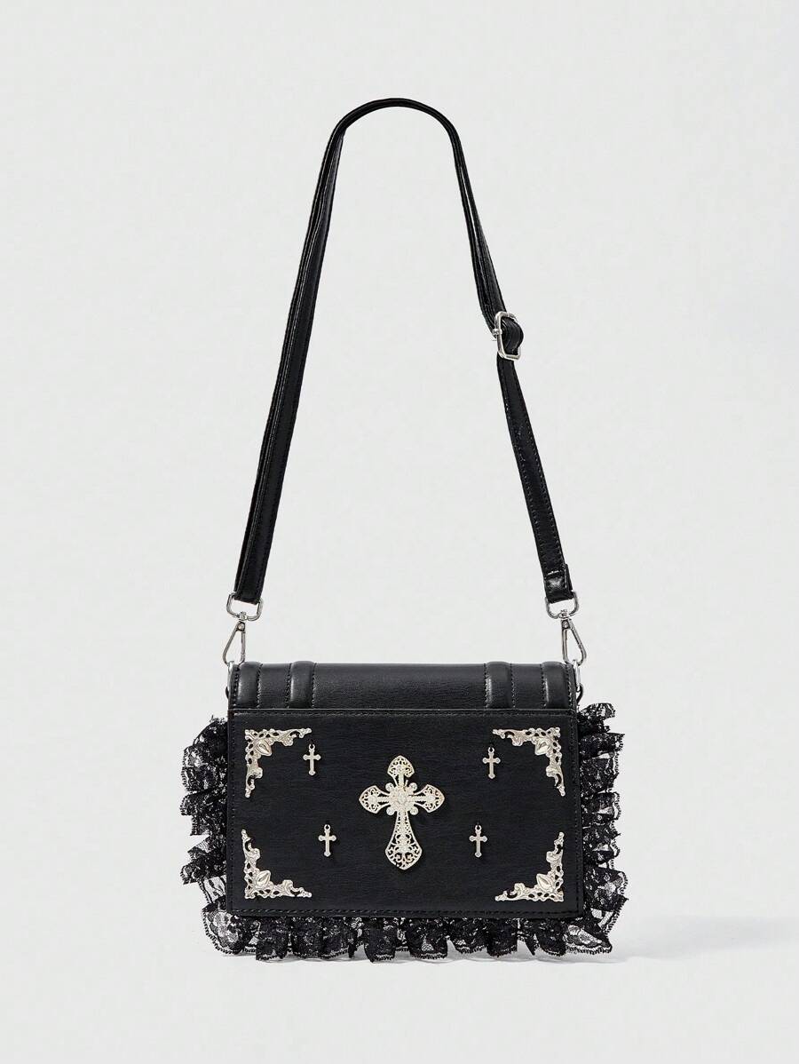 Women's Gothic Lace-Trimmed Book Bag With Sparkling Rhinestone Cross - Perfect For Halloween Nun Cosplay & Gothic Party Accessories Shoulder Bag