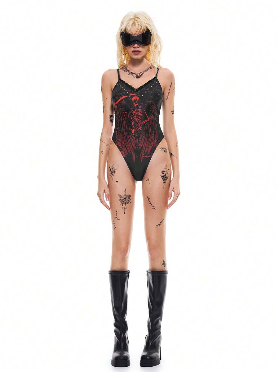 Goth Women's Lace Splice Spaghetti Strap Minimalist Slim Fit Casual One Piece Swimsuit Summer