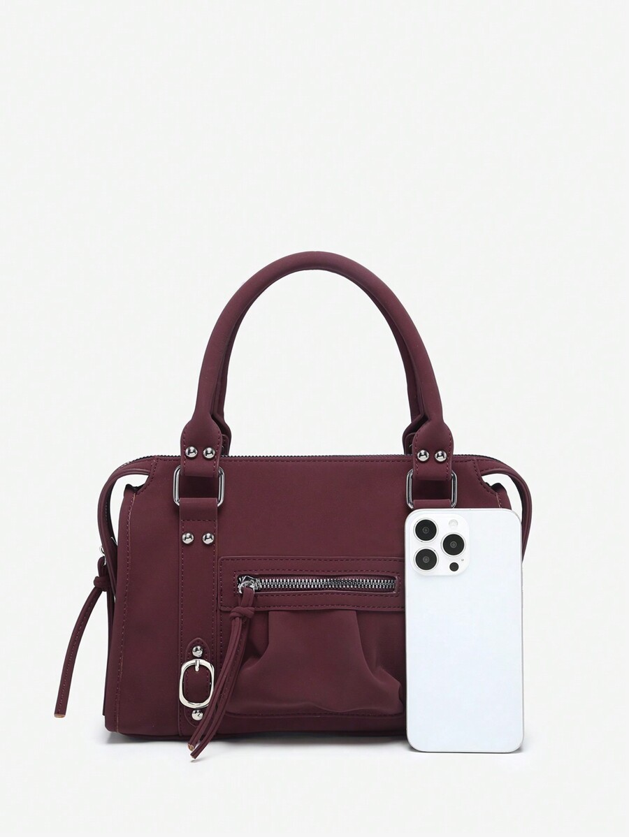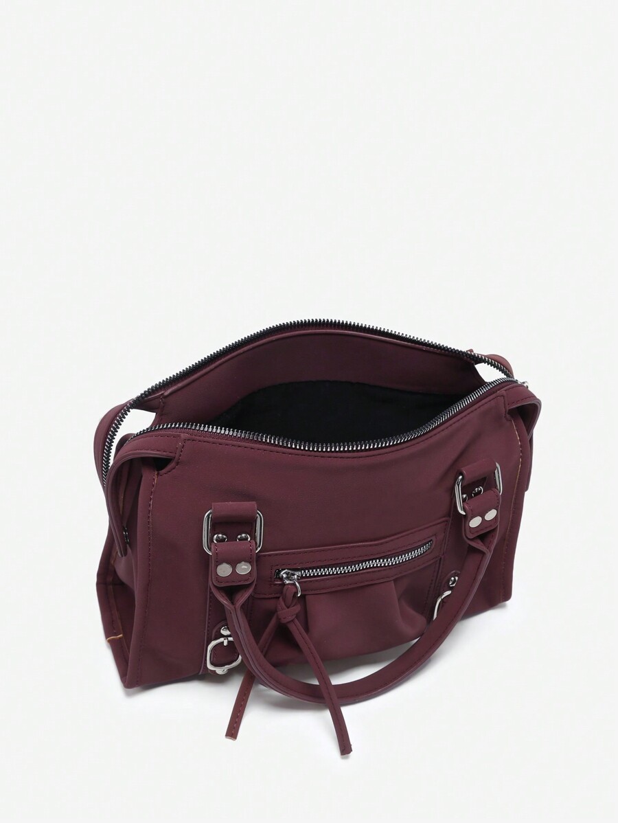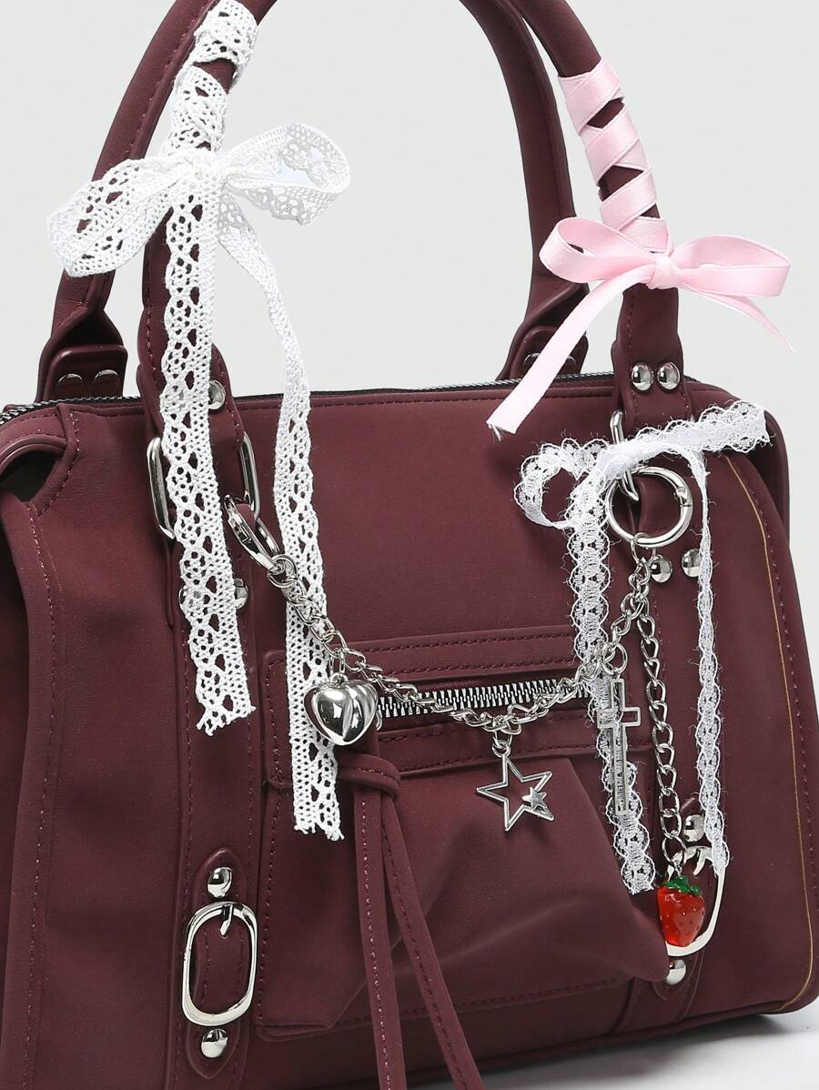 Goth Women's Retro Rivets Multi-Pocket Zipper Pearl Cross & Heart Decor Square Handbag, Suitable For Going Out & Dating