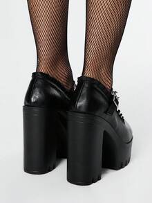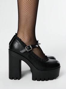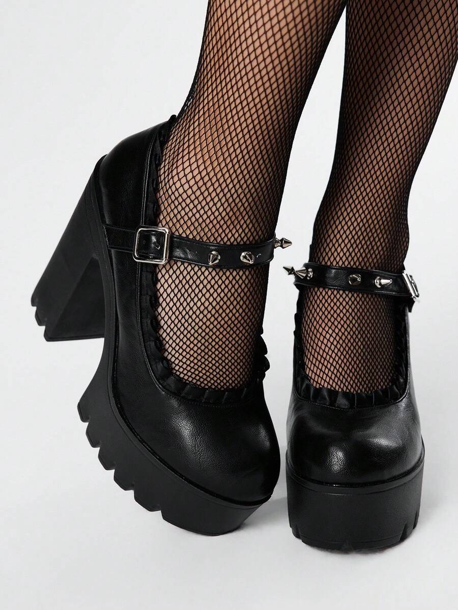 Goth Women's Sexy Lace Trim Thick Heel Pumps, Spring/Autumn Fashion Solid Color Metal Rivet Embellished Strap Buckle High Heel Low Vamp Autumn Shoes