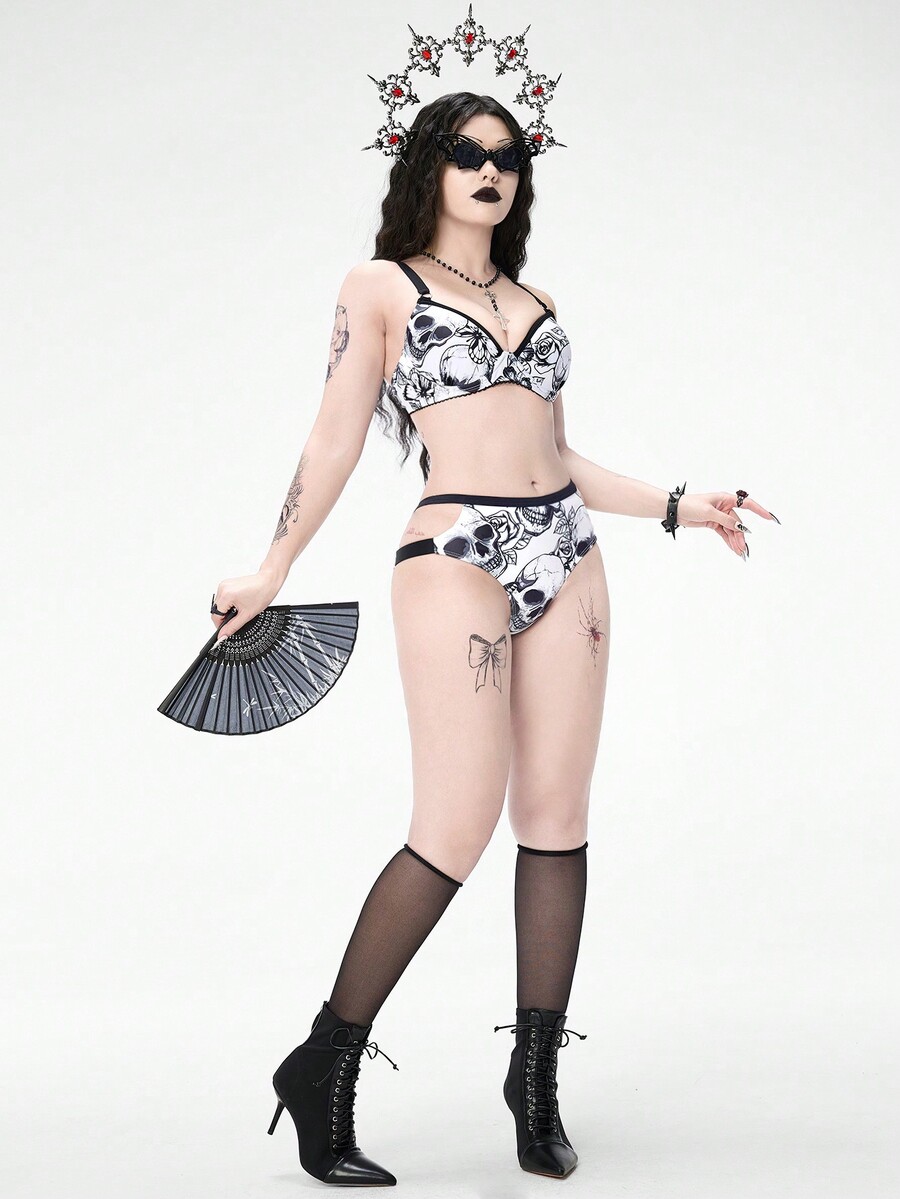 Goth Women's Sexy Skull & Butterfly Print Bikini Set, Halloween