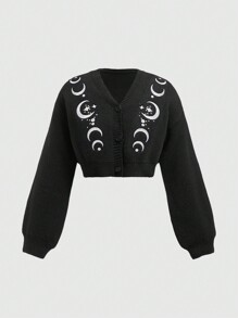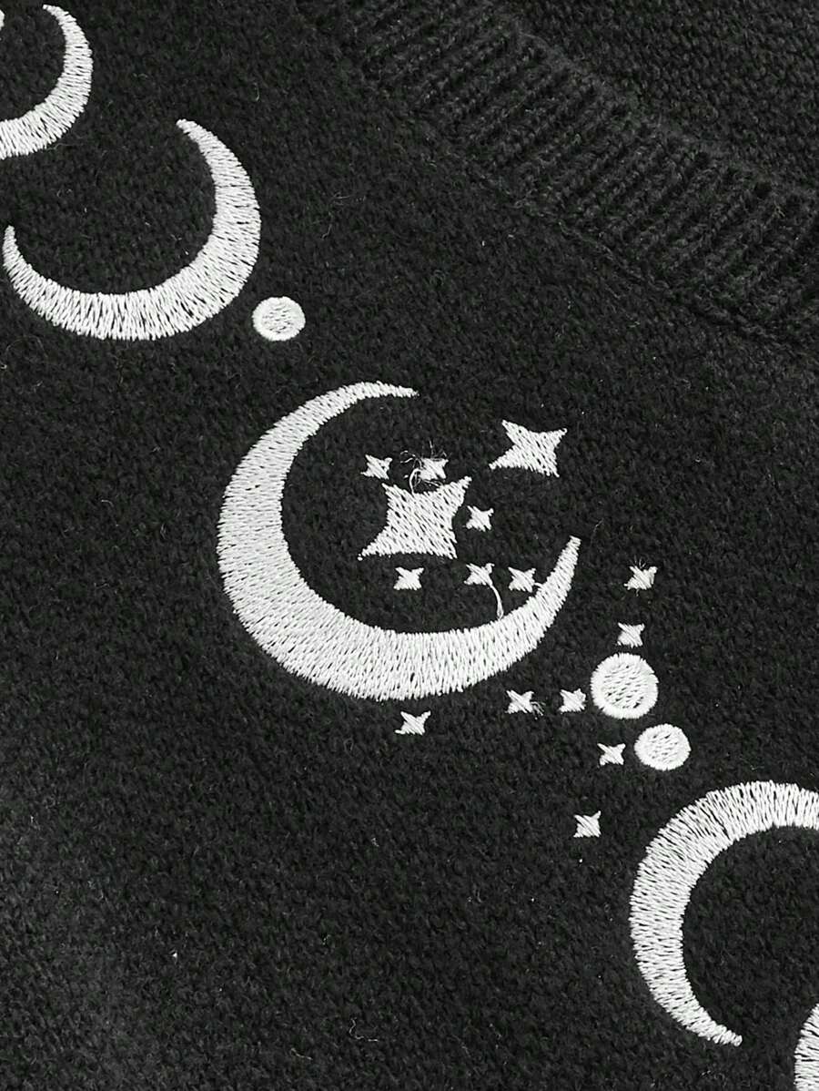 Goth Women's Short Knit Cardigan With V-Neckline And Star & Moon Embroidery