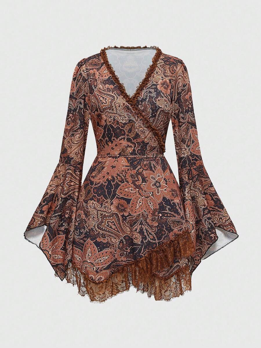 Goth Women's Vintage Floral Print V-Neck Flare Sleeve Lace Trim Dress