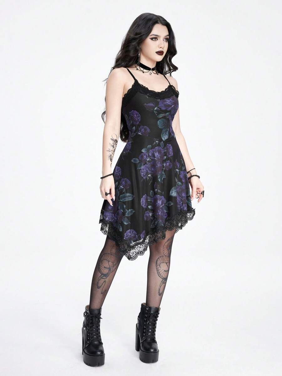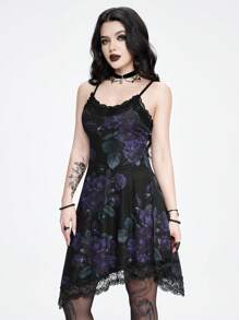 Goth Women's Vintage Rose Floral Allover Print Mesh Slip Dress