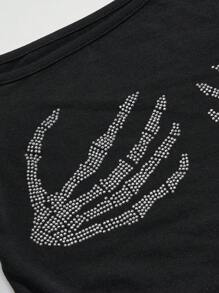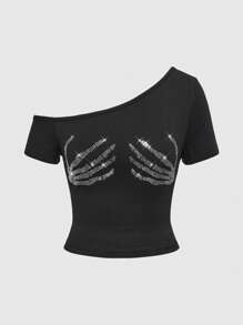 Goth Y2K Sexy Off Shoulder Skull & Palm Rhinestone Design Women T-Shirt, Summer/ Summerouis /Summer Cothes Women's Concert Costumes, Rave Costumes, Carnival Costumes, Country Concert Costumes