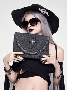 Gothic Black Straw Woven Clutch Envelope Bag With Cross & Chain Decor For Beach Vacation, Halloween