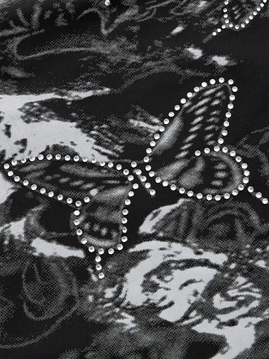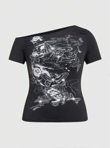 Gothic Butterfly Printed Rhinestone Decorated Asymmetrical Neck Ruched Plus Size T-Shirt