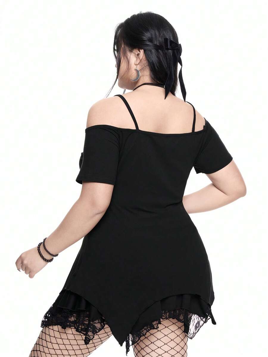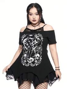 Goth Gothic Cat Star Skeleton Print Asymmetrical Hem Off Shoulder Lace Cami Plus Size T-Shirt, Rave, Festival Streetwear, Halloween