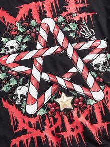 Gothic Christmas Skeleton Candy Cane Pentagram Print Oblique Shoulder Loose Sweatshirt