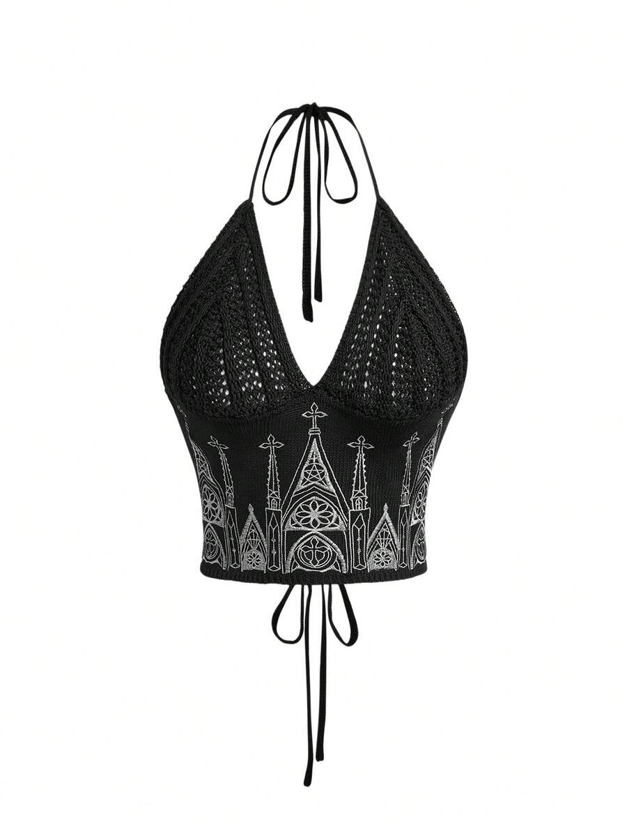 Gothic Church Embroidery Mock Neck Fitted Knit Top