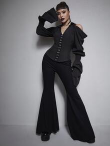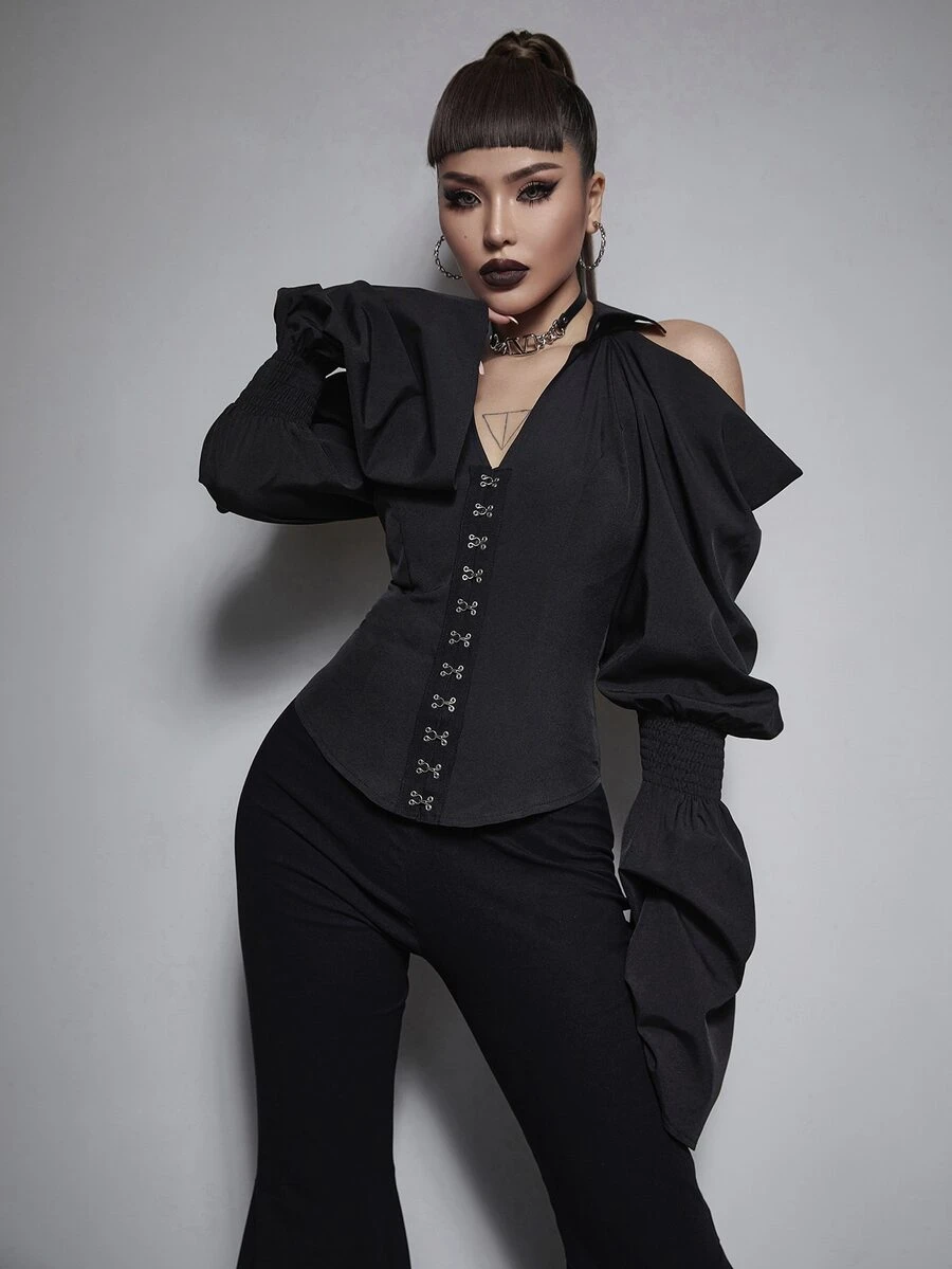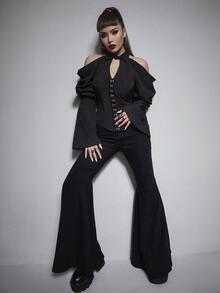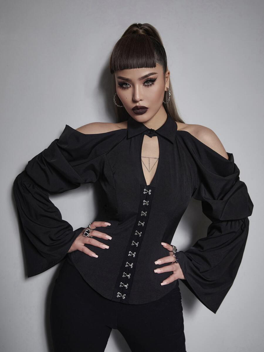 Gothic Cold Shoulder Bell Sleeve Hook and Eye Placket Top