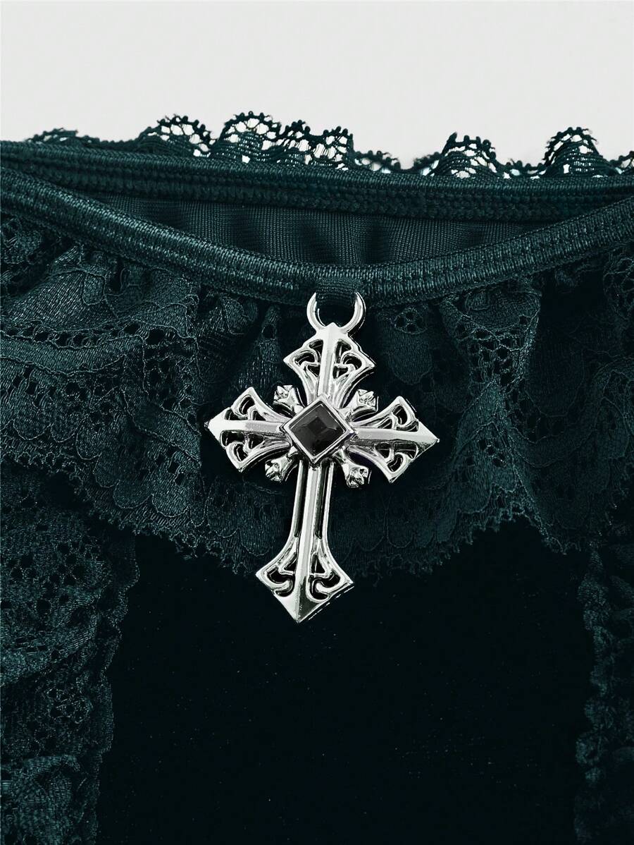 Gothic Court Style Cross Decor Lace Panel Velvet Off-Shoulder Women Blouse