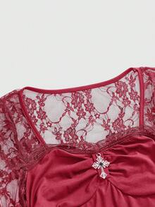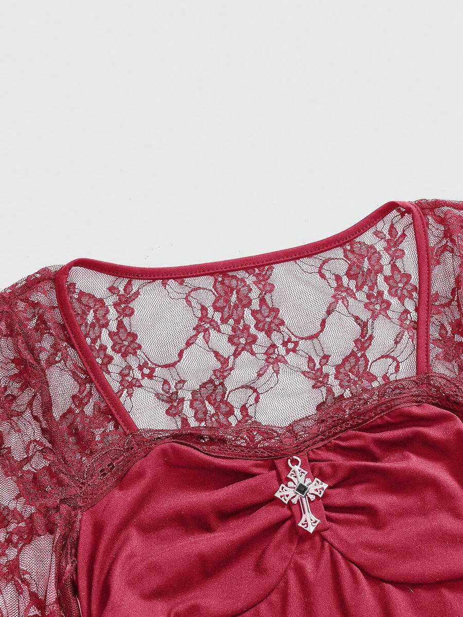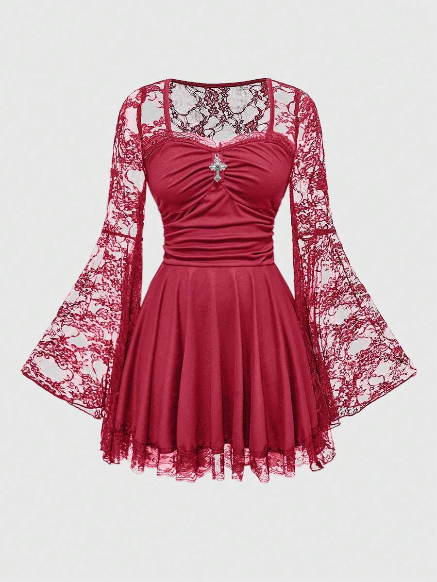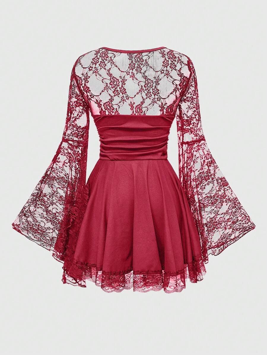 Gothic Cross Lace Patchwork Square Neck Flare Sleeve A-Line Christmas Dress For Women