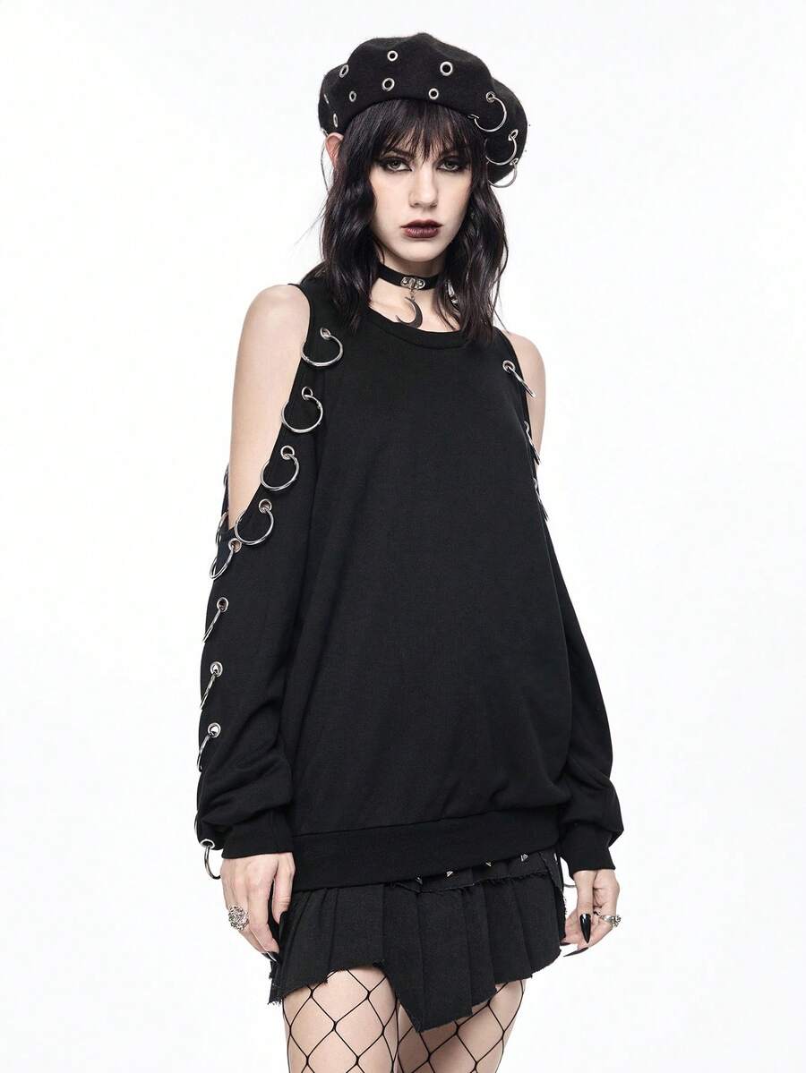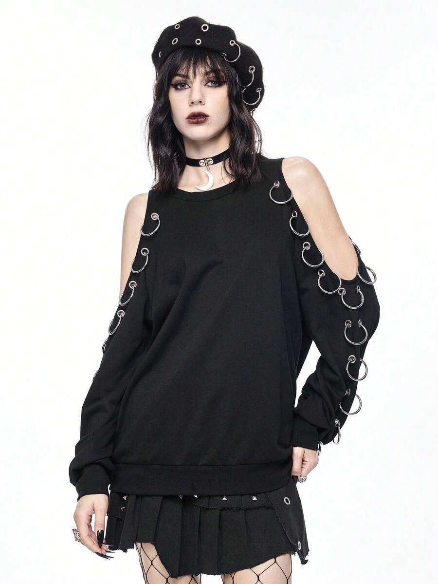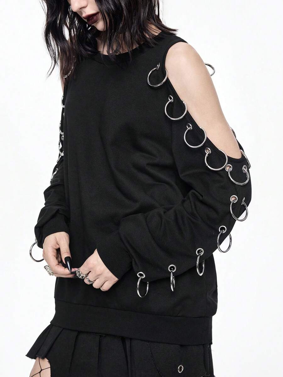 Gothic Cutout Shoulder Metal Grommet Decor Women Sweatshirt