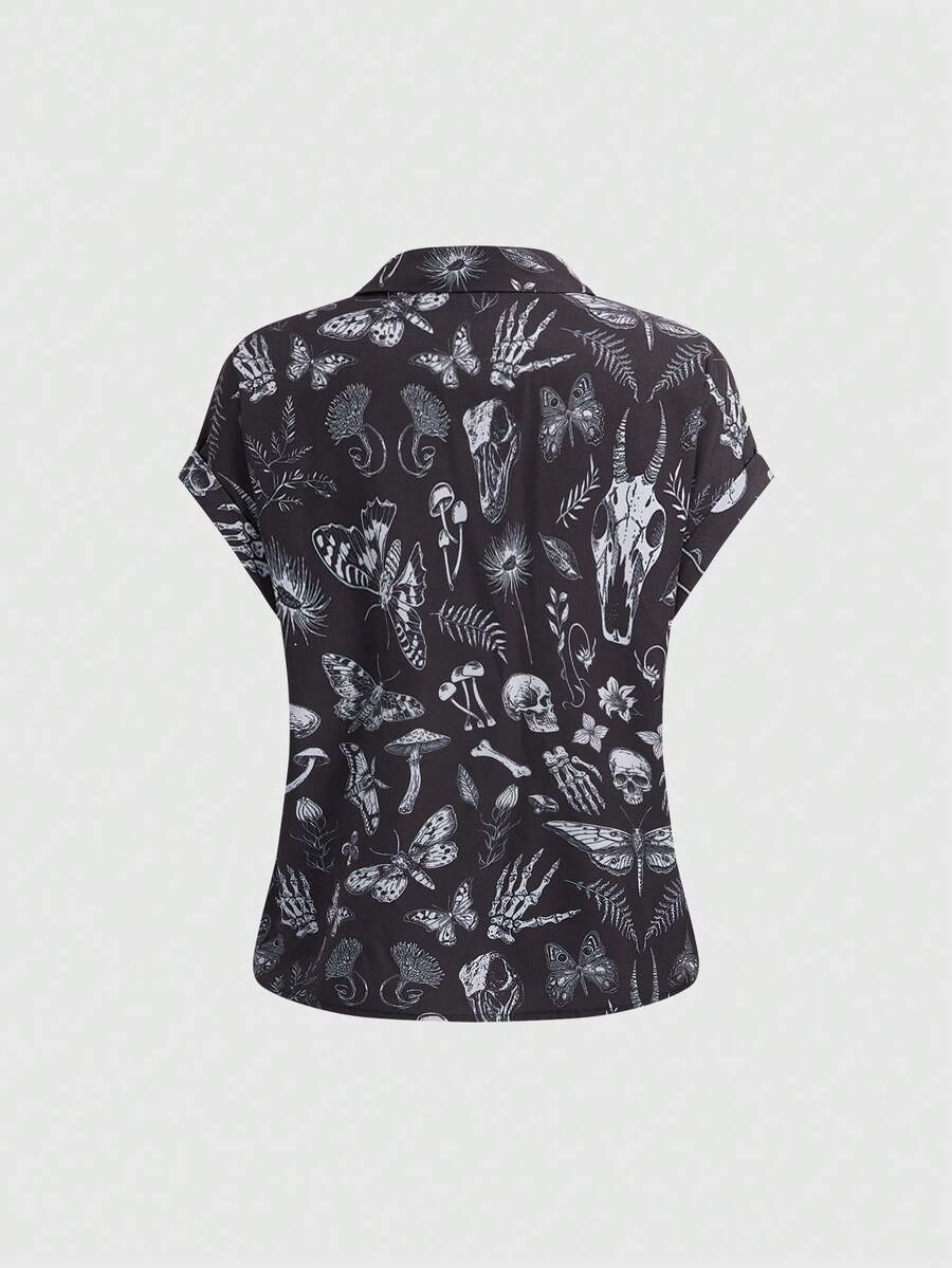Gothic Dark Floral Botanical Garden Skull Mushroom Sun Moon Star Print Button-Up Shirt For Women, Spring/Summer