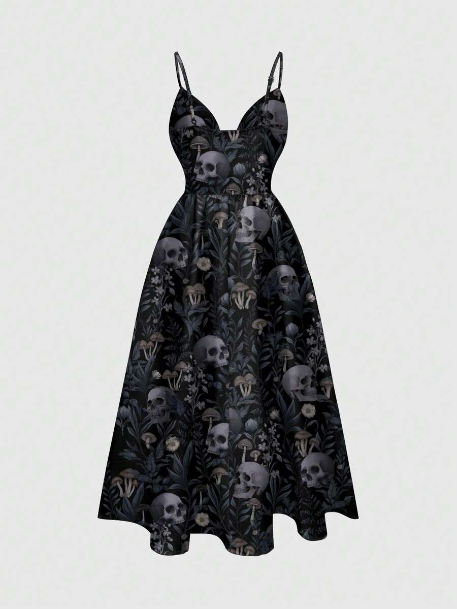 Gothic Dark Forest Vintage Skeleton Mushroom Leaf Print Slip Dress For Women