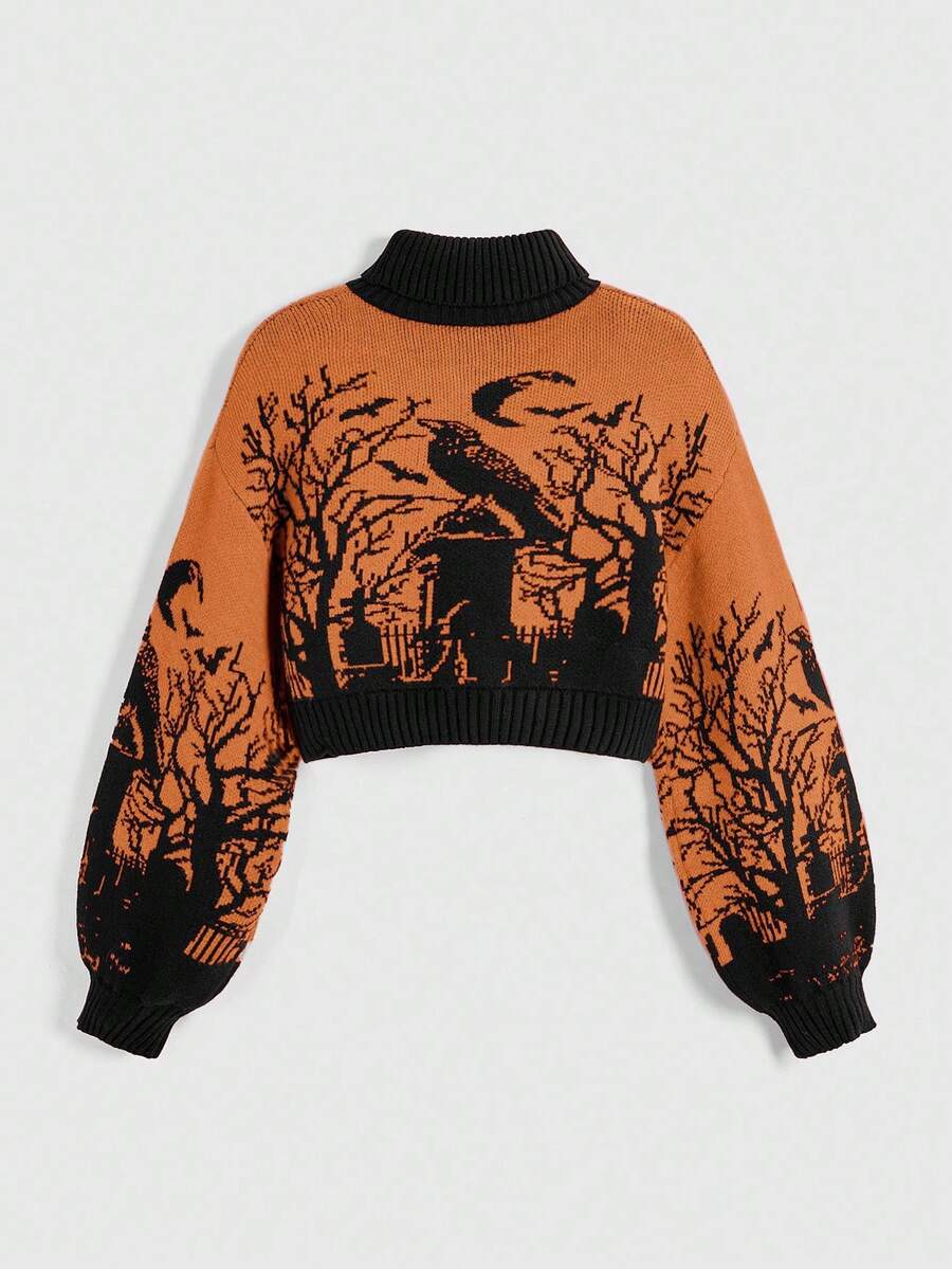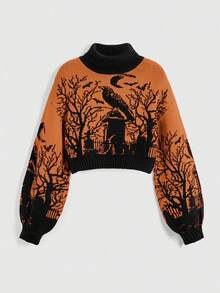 Goth Gothic Dark High Neck Warm Raven Graveyard Moon Bat Branch Jacquard Lantern Sleeve Women Sweater, Halloween