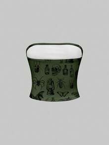 Goth Gothic Dark Mysterious Halloween Full Print Skeleton, Moth, Mushroom, Bow Tie, Nature Green Women Top