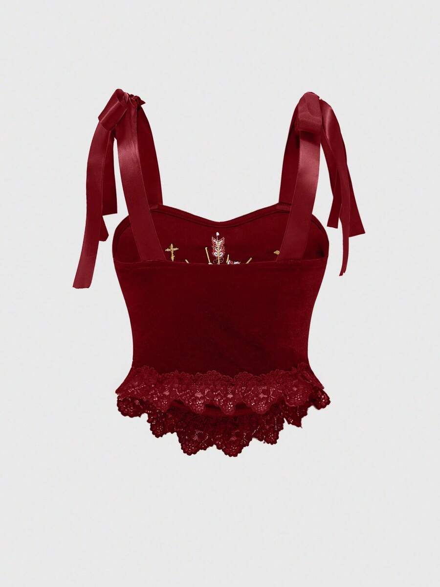 Gothic Dark Red Heart Embroidery Velvet & Lace Ribbon Tie Cropped Top