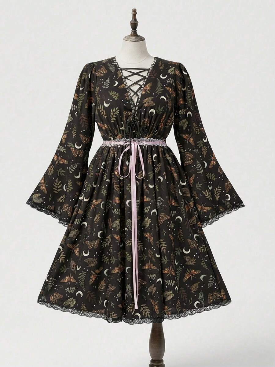 Gothic Dark Thorn Witch Plant Butterfly Moon Print Lace-Up Long Dress, Elegant Vintage Plus Size Women Dress