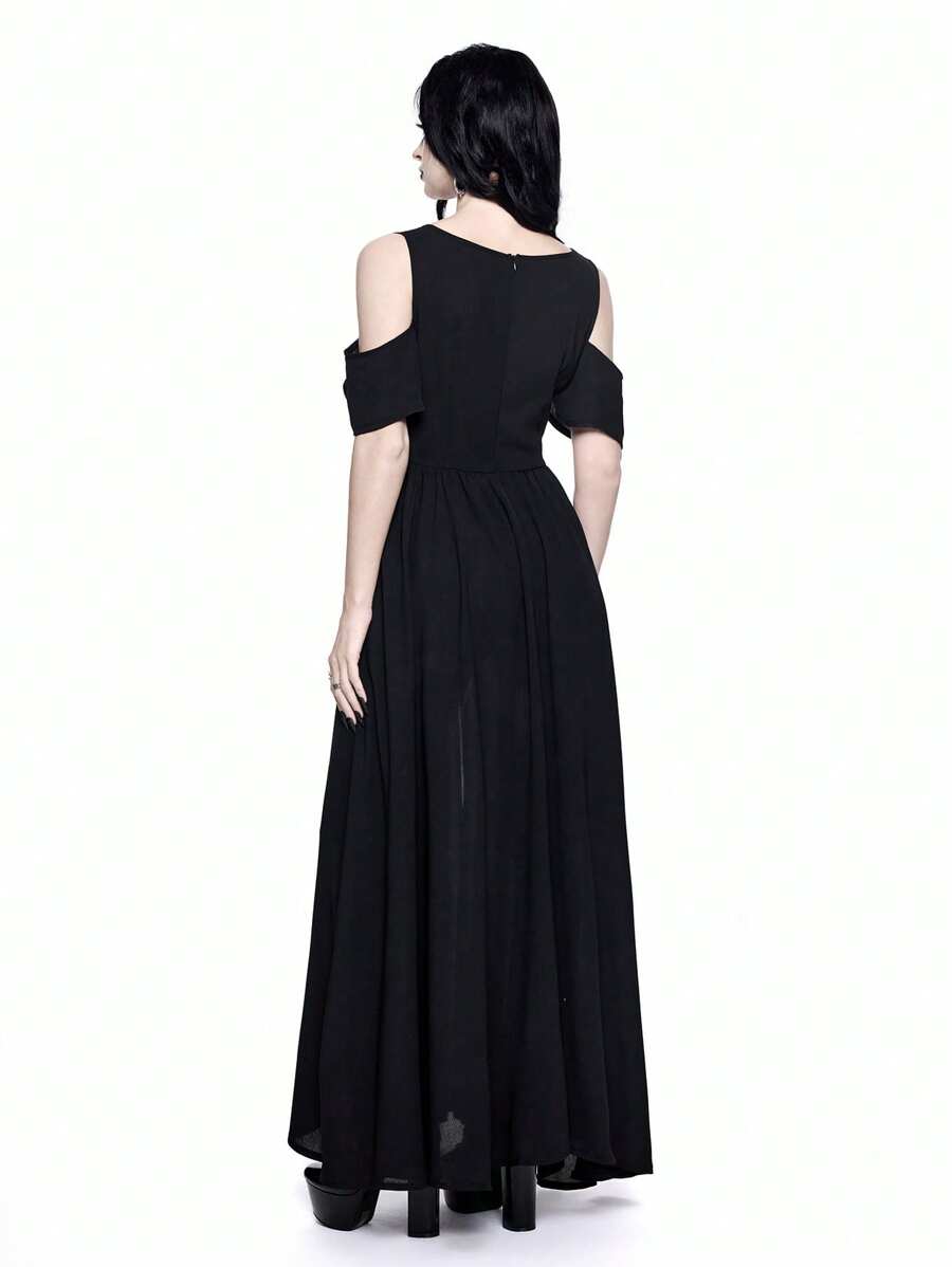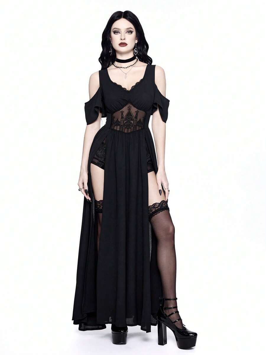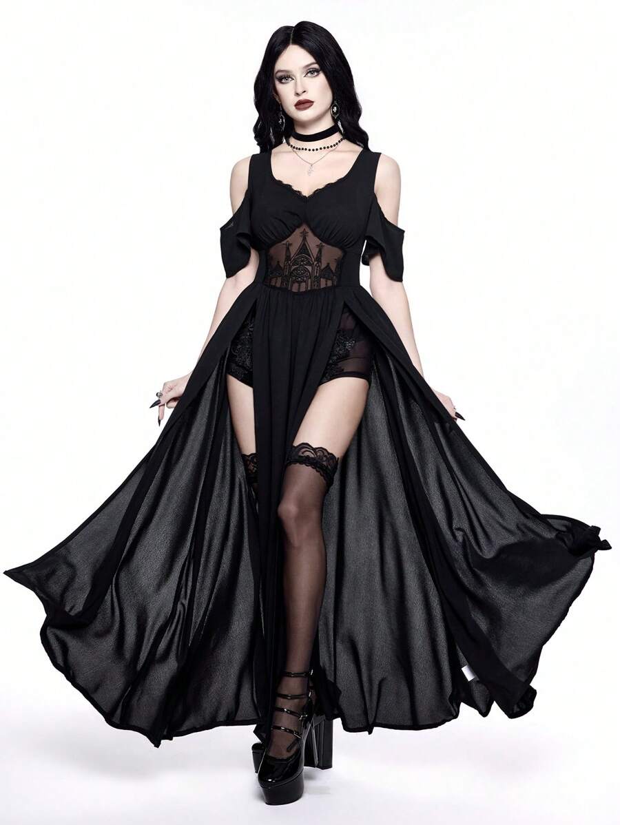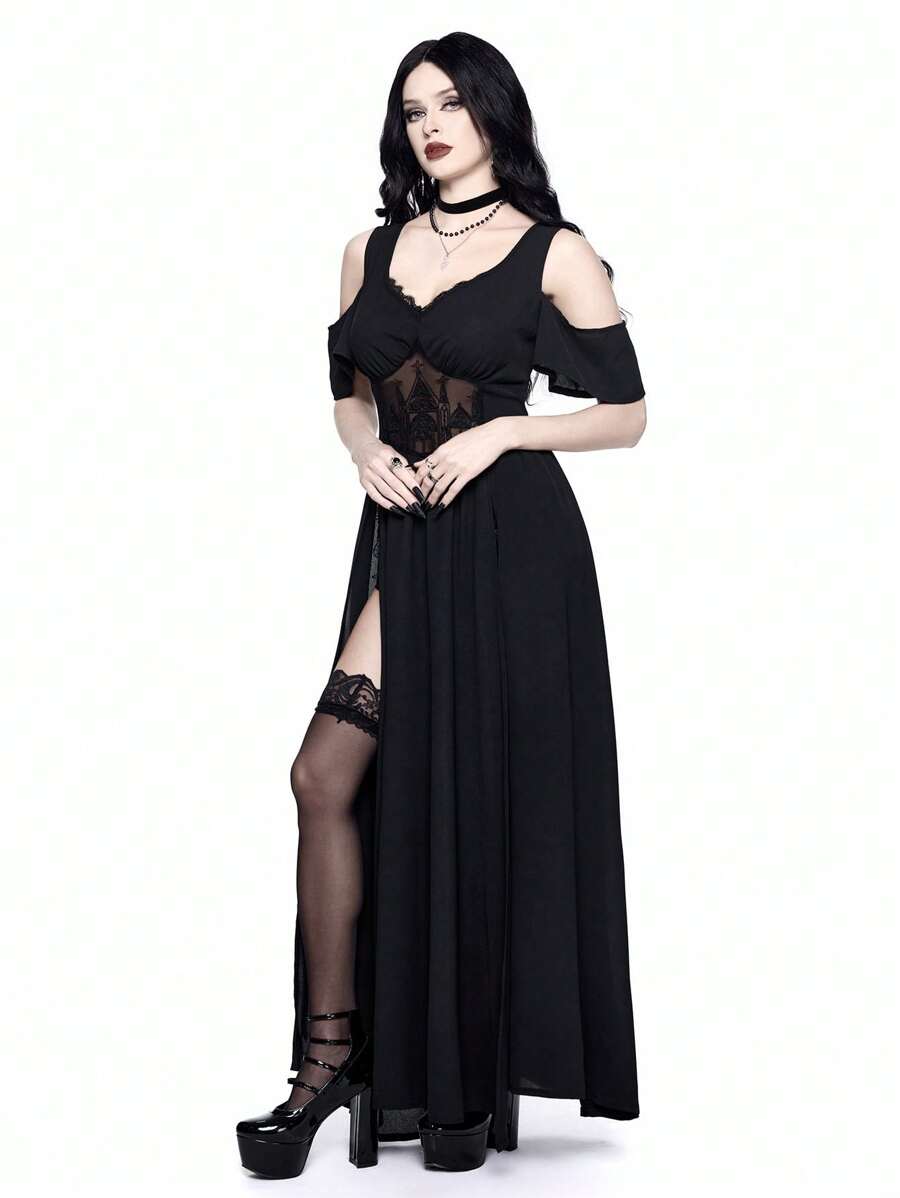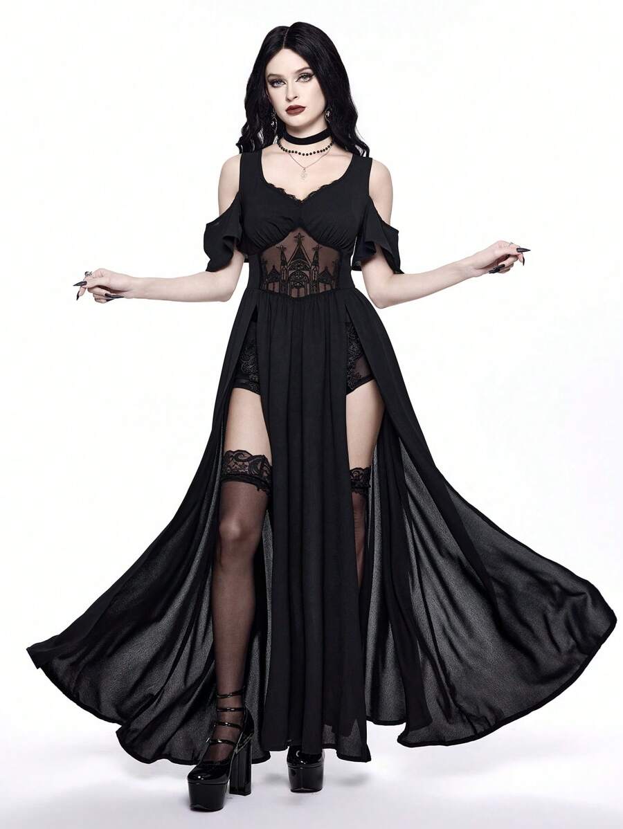 Gothic Embroidered Hollow Pattern Deep V-Neck Off Shoulder High Slit Dress, Women Summer Prom Outfit Women Dresses Elegant Gown