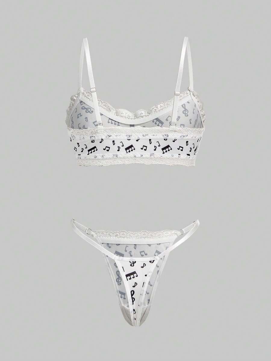 Gothic Floral Lace & Music Note Pattern Camisole And Thong Lingerie Set