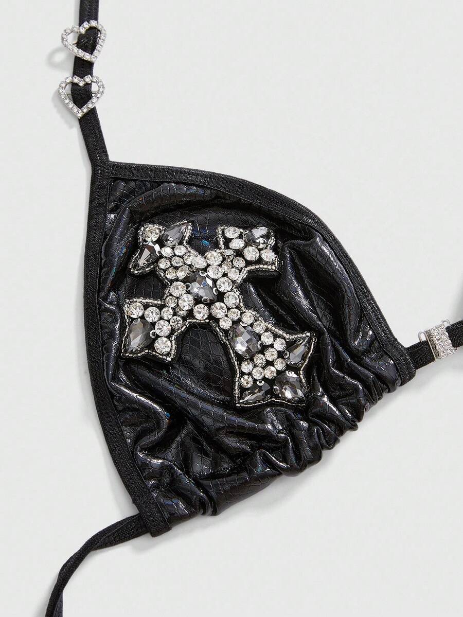 Gothic Glitter Cross & Heart Decor Wireless PU Sexy Bra For Women