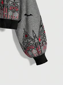 Gothic Halloween Castle & Cross Pattern Women's Turtleneck Contrast Color Pullover Sweater