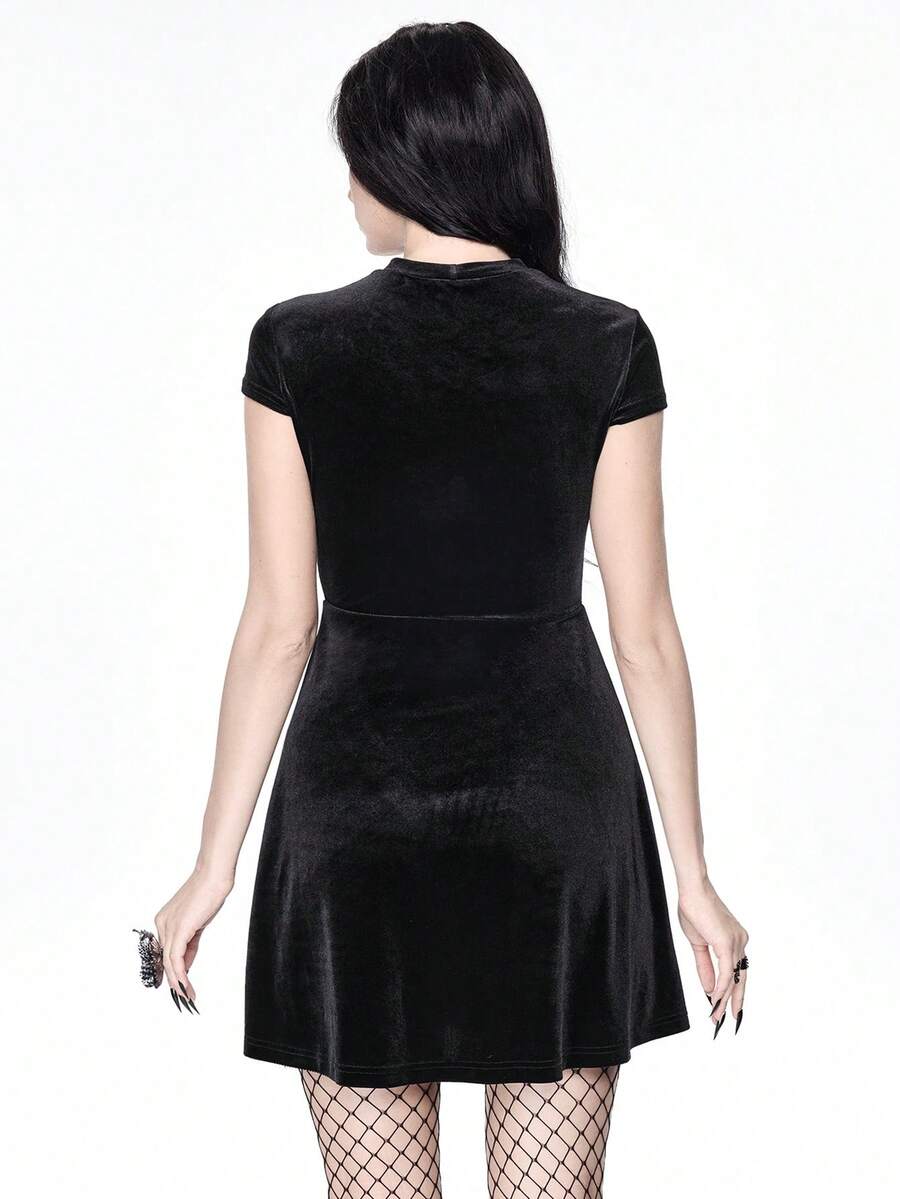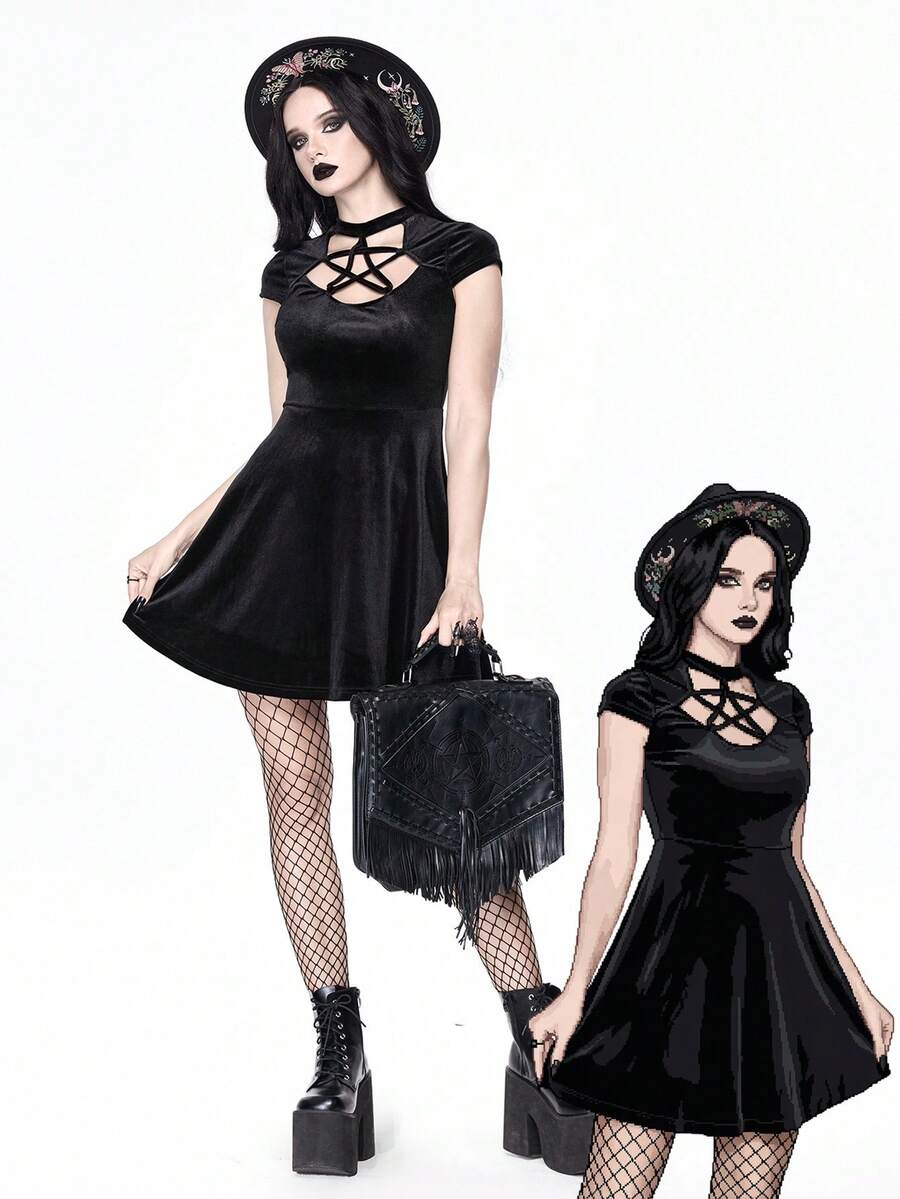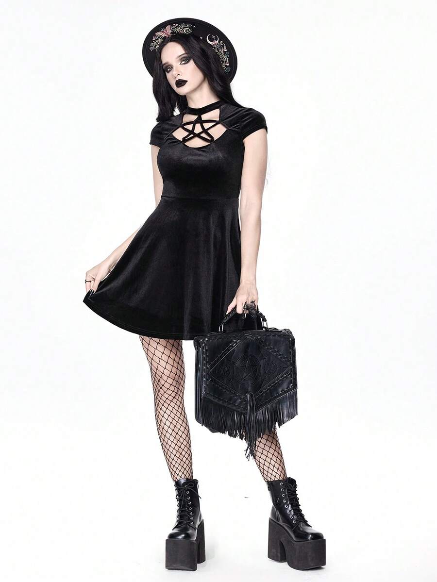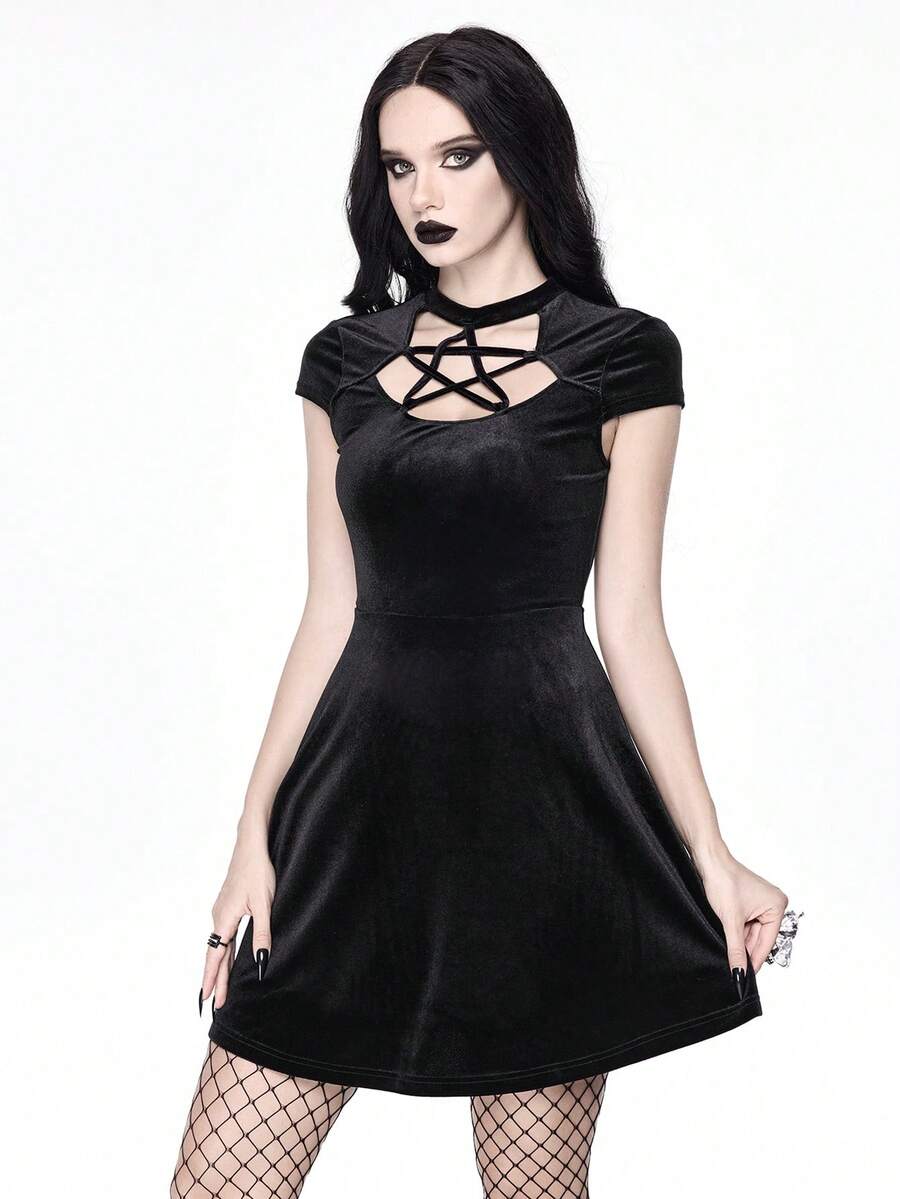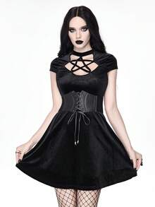 Gothic Hollow Out Pentagram Front Velvet Dress