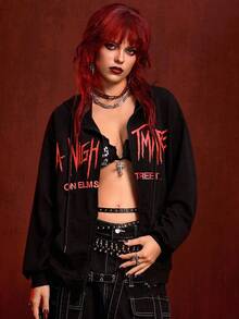 A Nightmare on Elm Street X ROMWE Gothic Horror Dark Claw Marks & Blood Print Logo Zip-Up Hoodie For Women