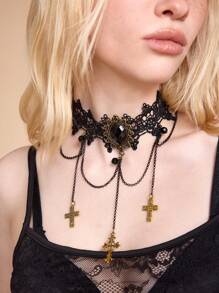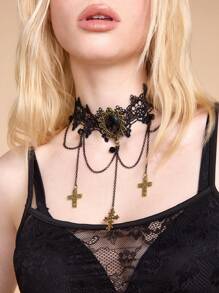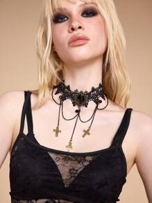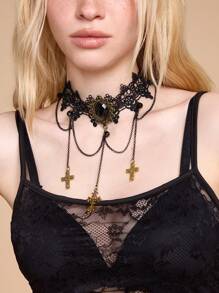 Gothic Lace Tassel Cross Punk Y2K Style Choker Necklace For Women