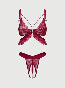 Gothic Lace Trim, Pearl, Bow Triangle Cup Bra And Crotchless Thong Sexy Lingerie Set