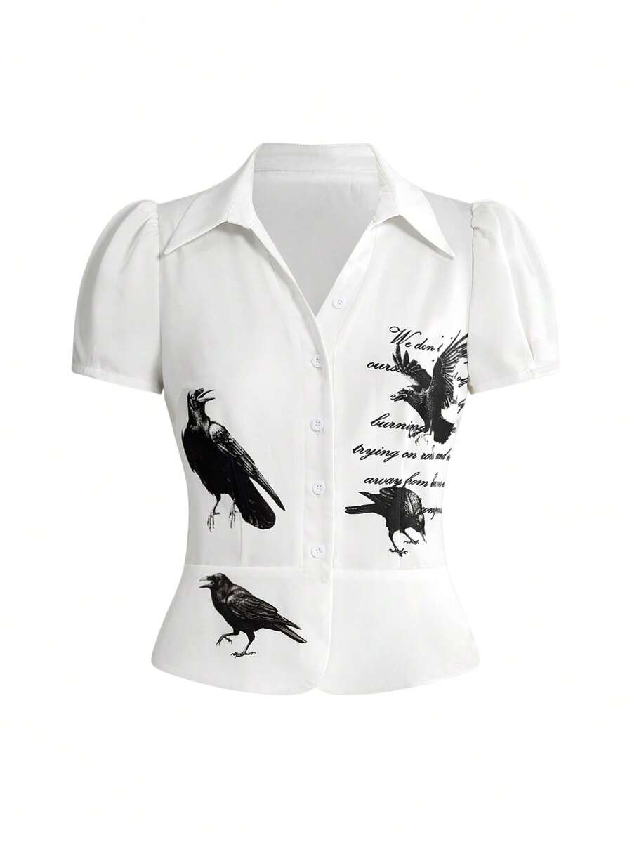 Gothic Lolita Crow Print Puff Sleeve Fitted Women Shirt