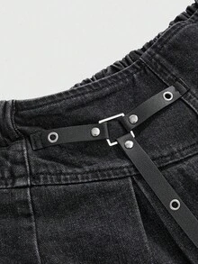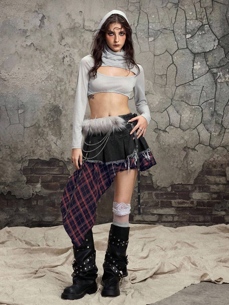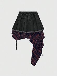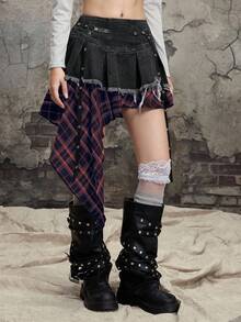 Gothic Patchwork Plaid Asymmetrical Hem Denim Mini Skirt