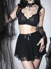 Gothic Polka Dot Mesh Bow Underwire Bralette, Thong Panty And Mini Skirt Sexy Lingerie Set
