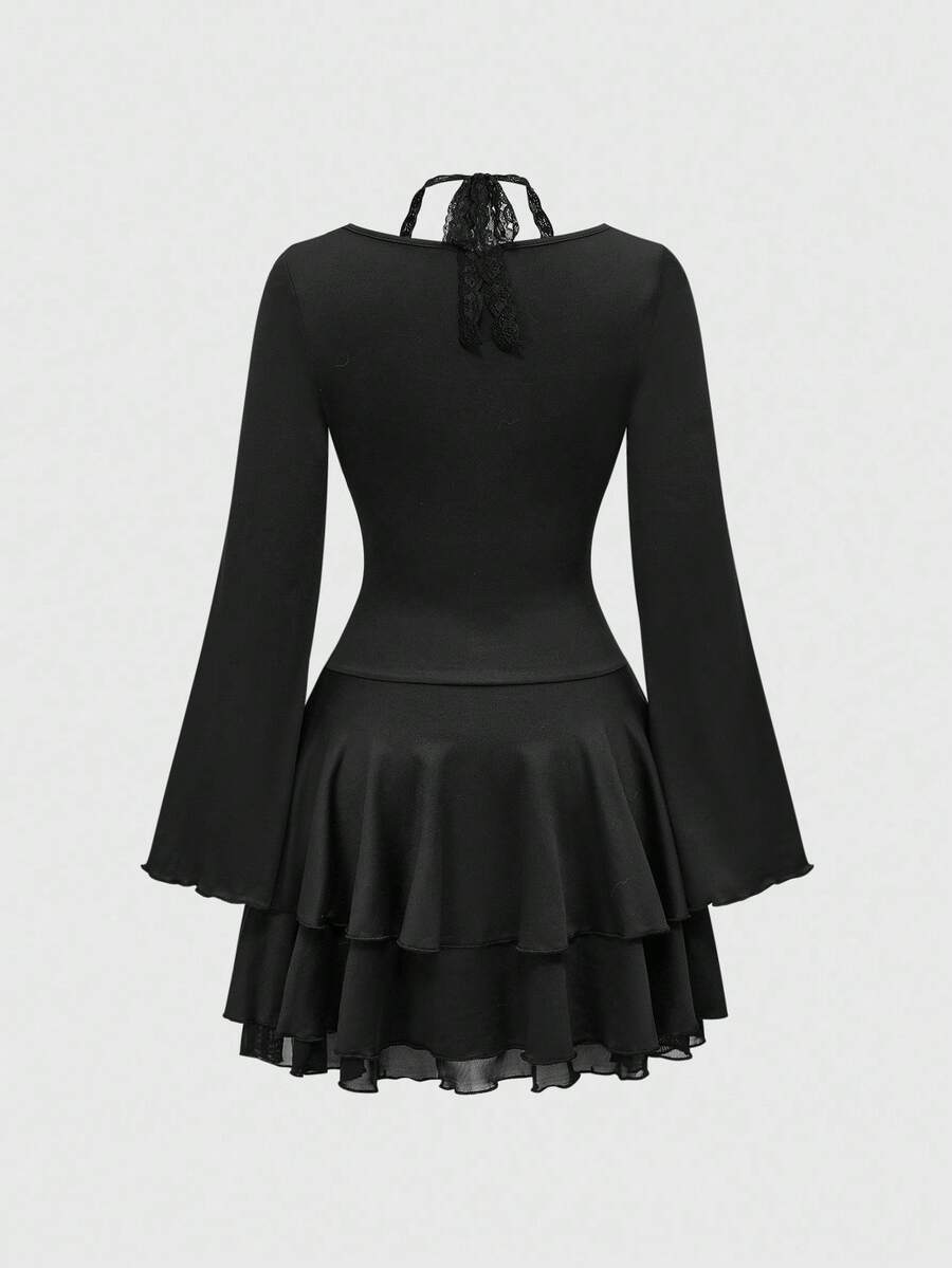 Goth Gothic Punk Cross Decor Multi-Layer Choker Flare Sleeve Lace-Up Mini Dress For Women