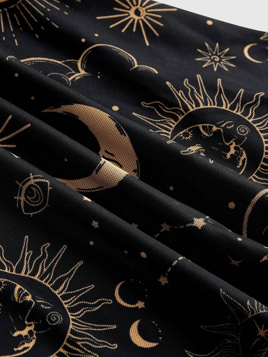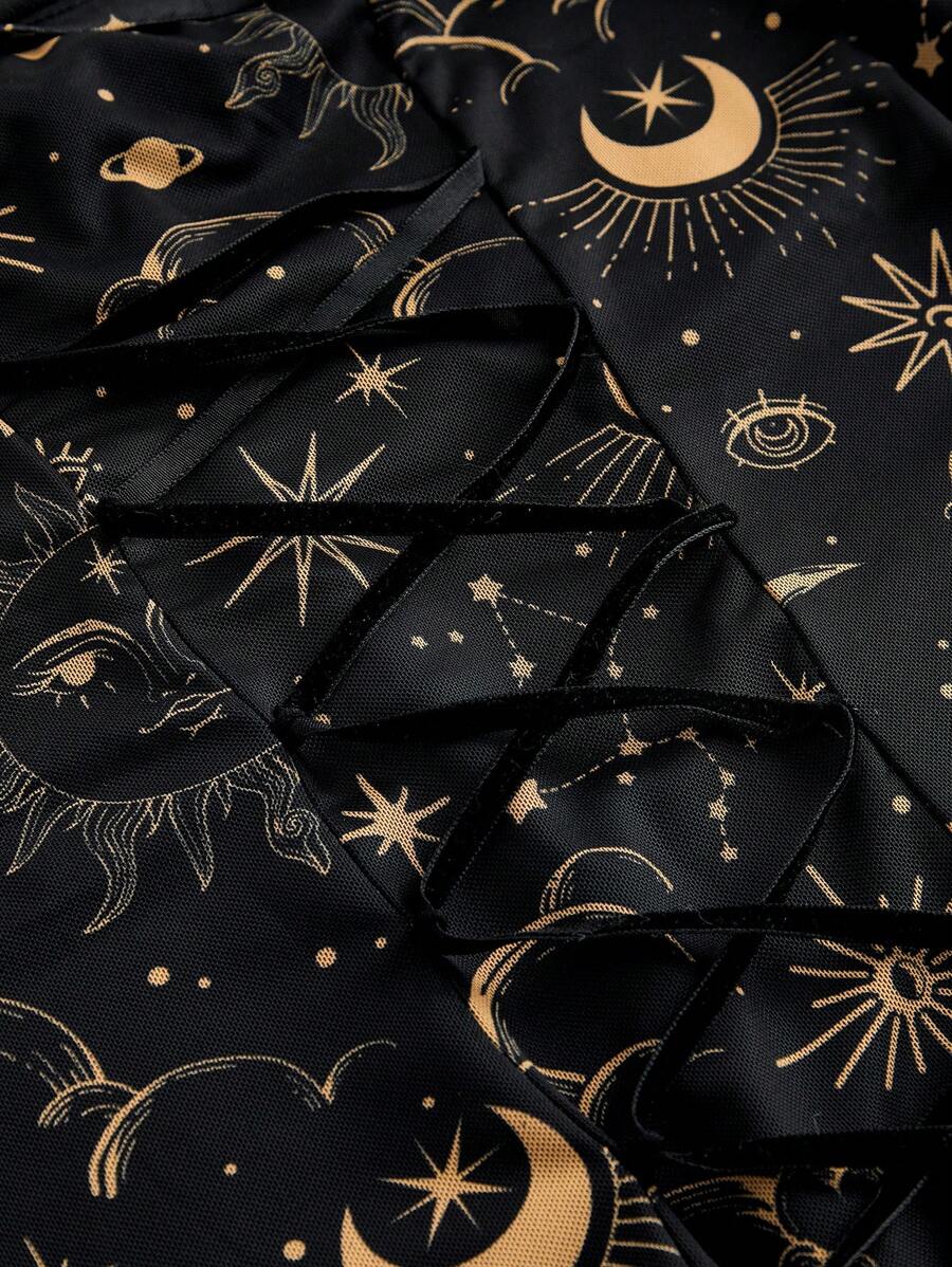 Gothic Retro Mysterious Star & Moon Allover Print Off Shoulder Bell Sleeve Mesh A-Line Dress