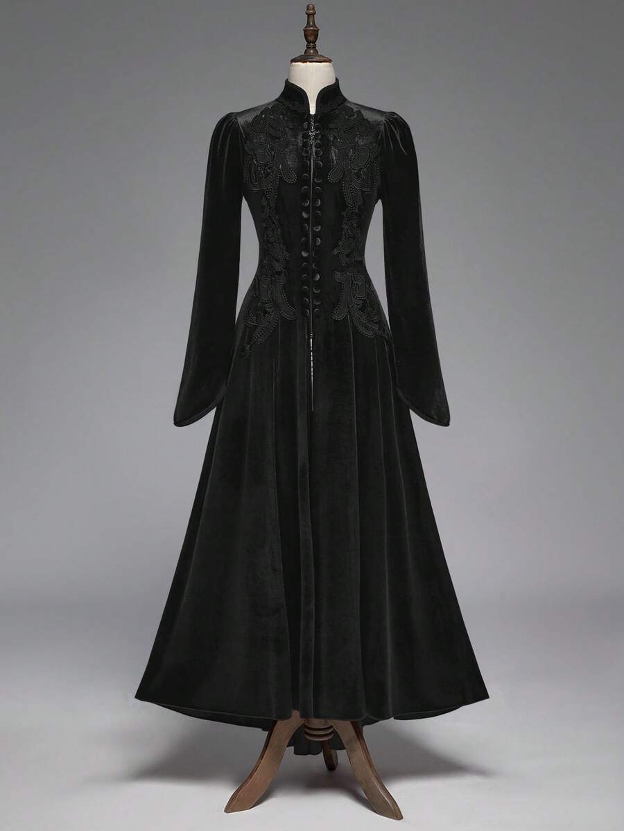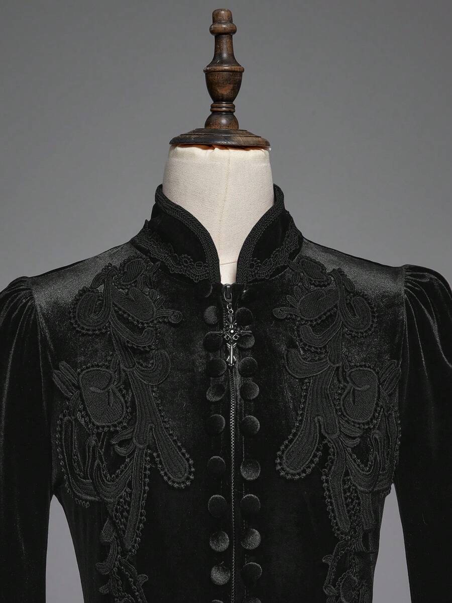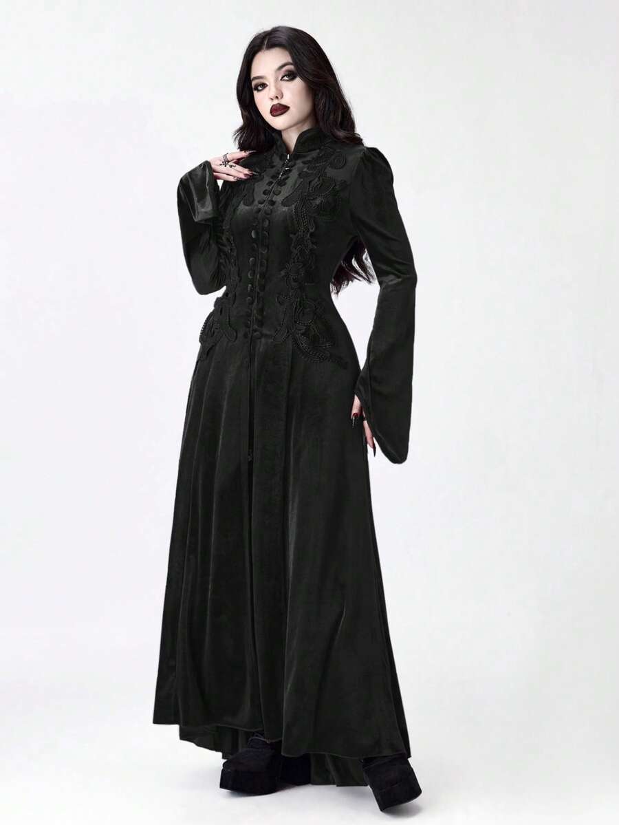 Gothic Retro Palace Style Contrast Color Lace Trim Velvet Long Jacket For Women