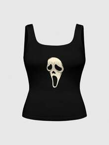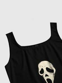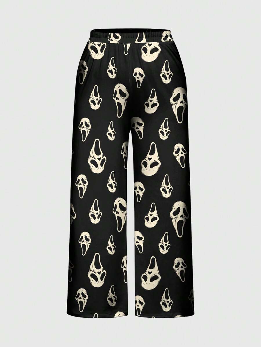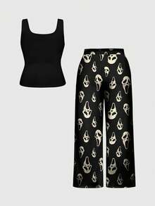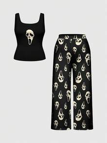 Gothic Skull & Ghost Allover Print Plus Size Sleeveless Top And Pants Pajama Set, Casual Loungewear
