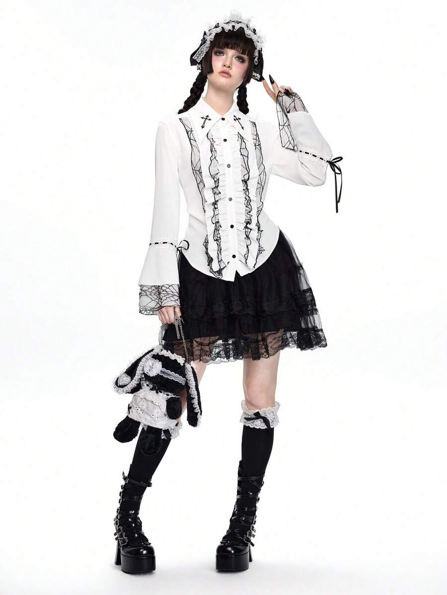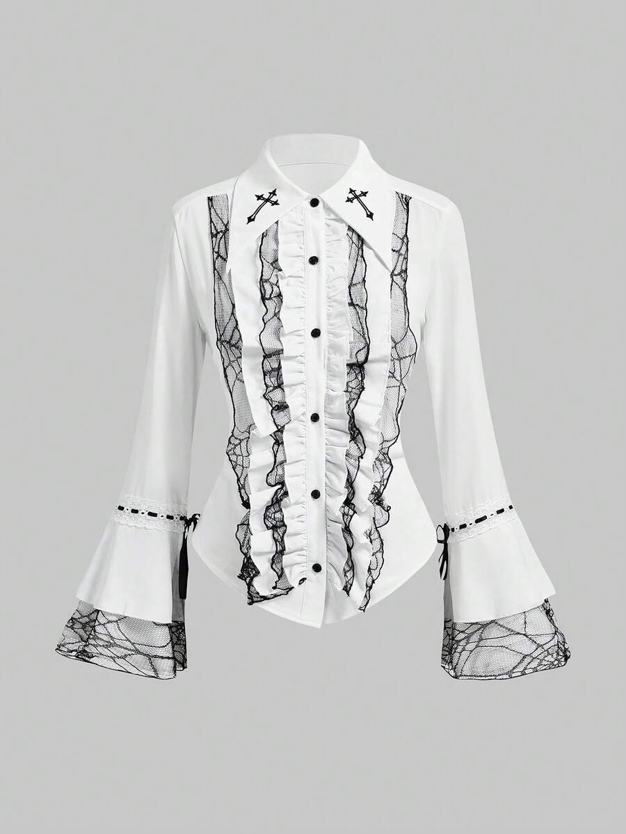 Gothic Spider Web Lace Ruffle Trim Fitted Women Blouse